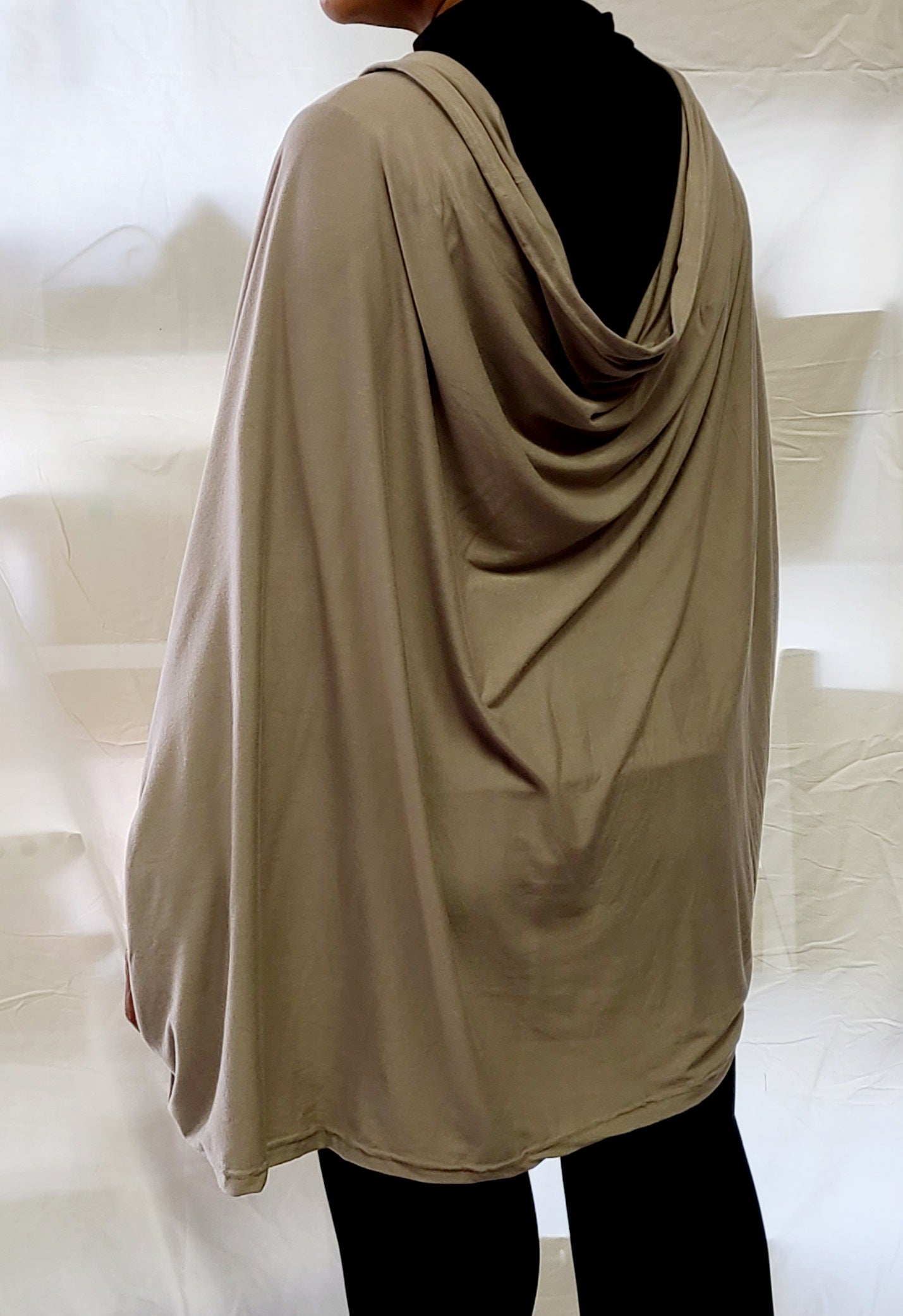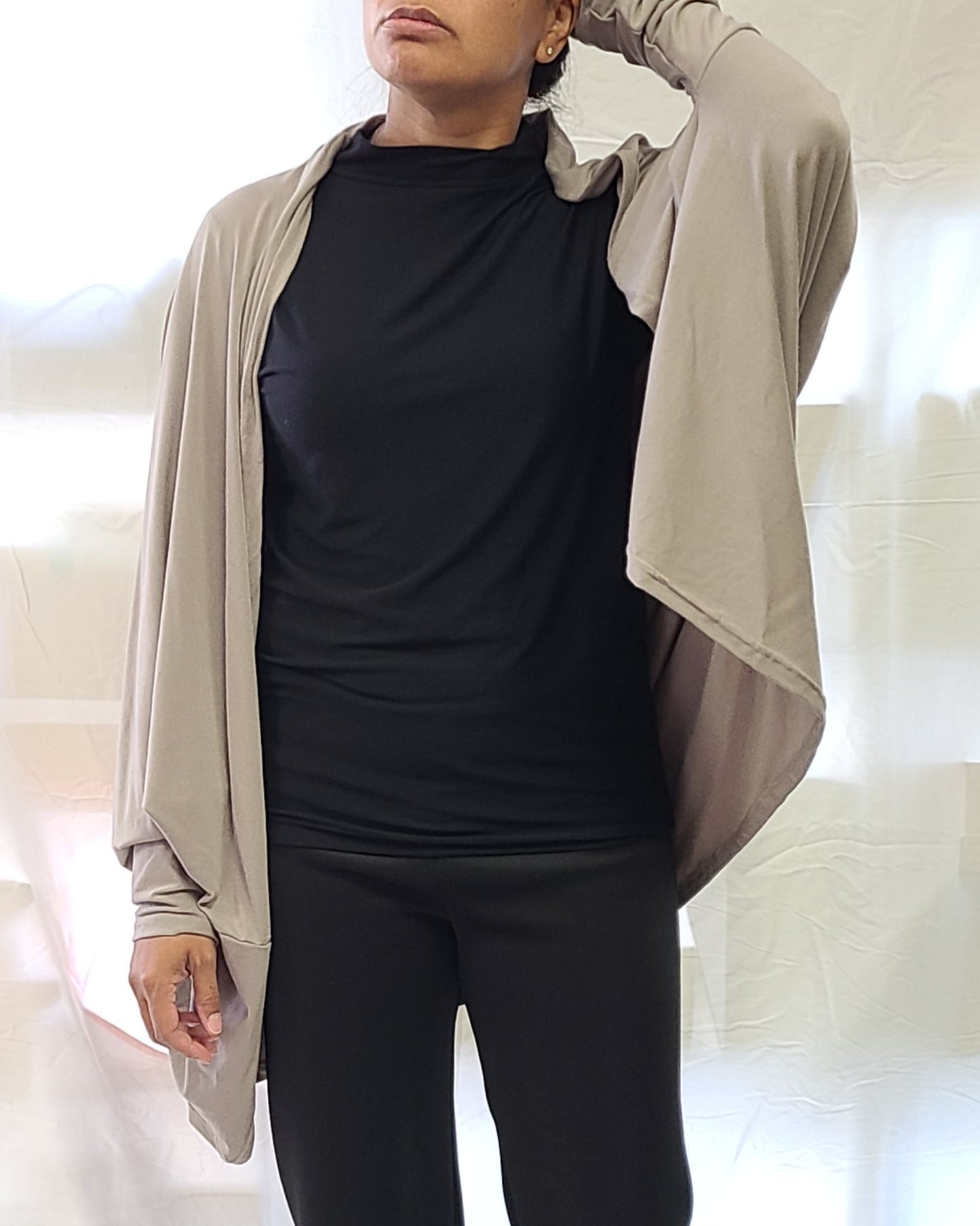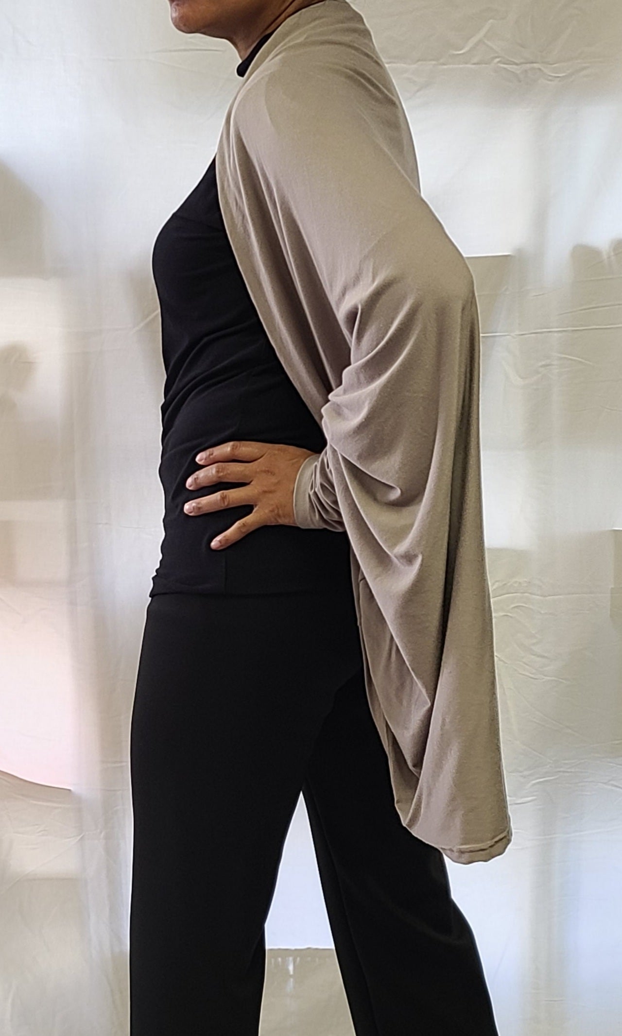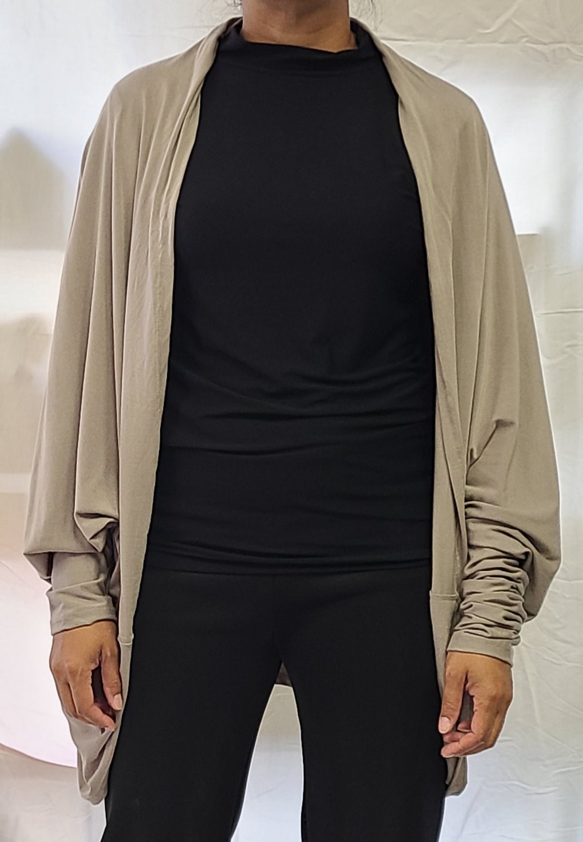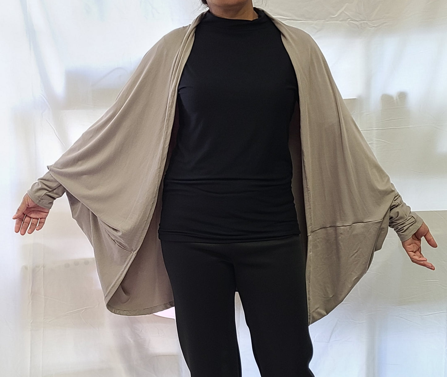 Bamboo one size cardigan. One size off the shoulder cut. This cardigan is soft and silky. Available in sand colour. Wear it out about town or throw it on to lounge around the house.