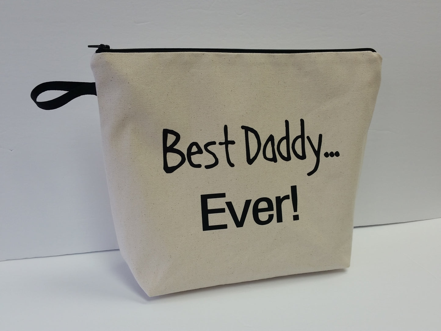 Best Daddy Ever toiletry, wash bag. Made from an organic cotton canvas exterior and and organic cotton canvas interior. Great for storing anything. Heat pressed in black. Generous size.
