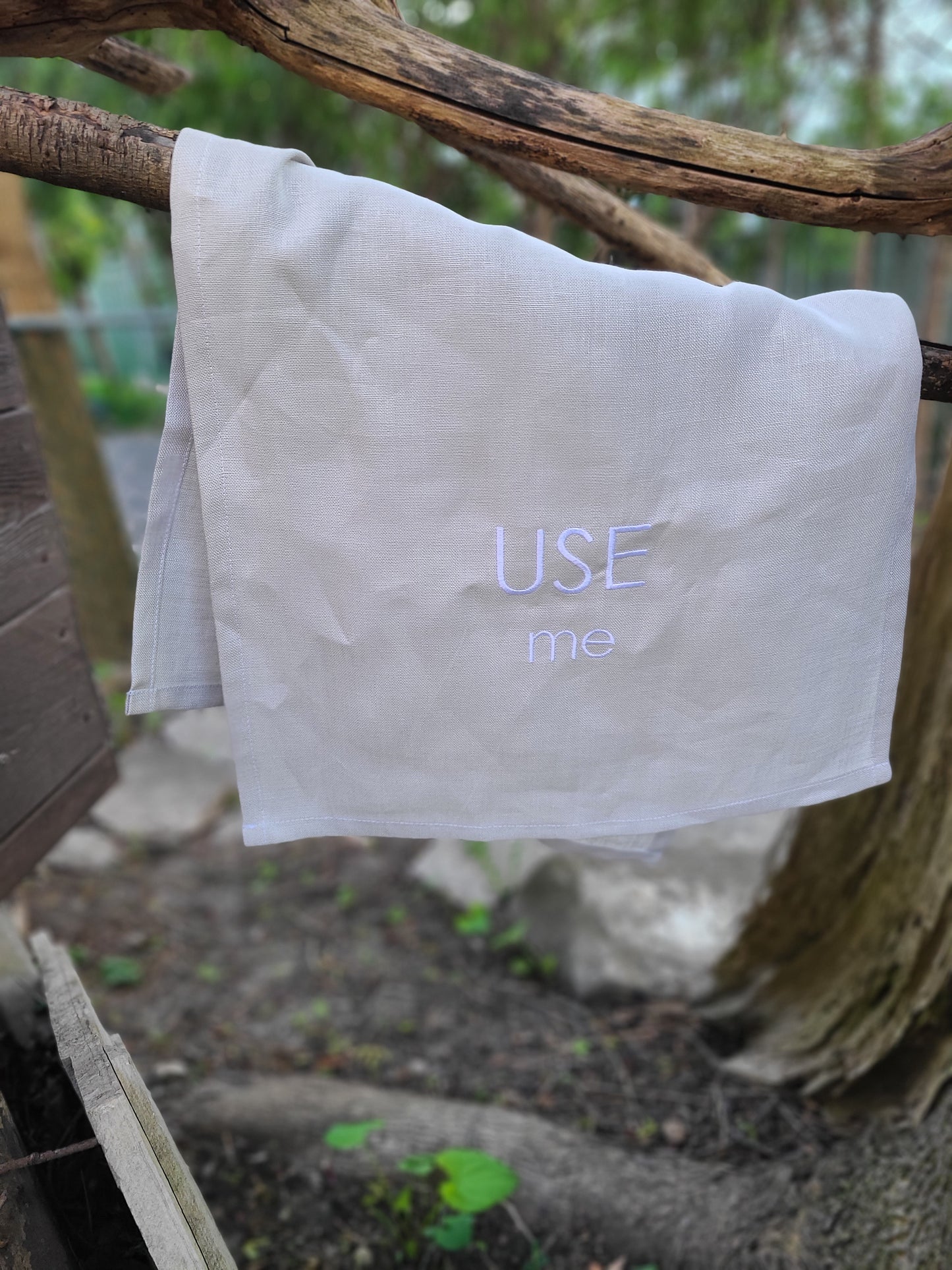A dove grey coloured Linen tea towel embroidered with "Use Me" in white thread.