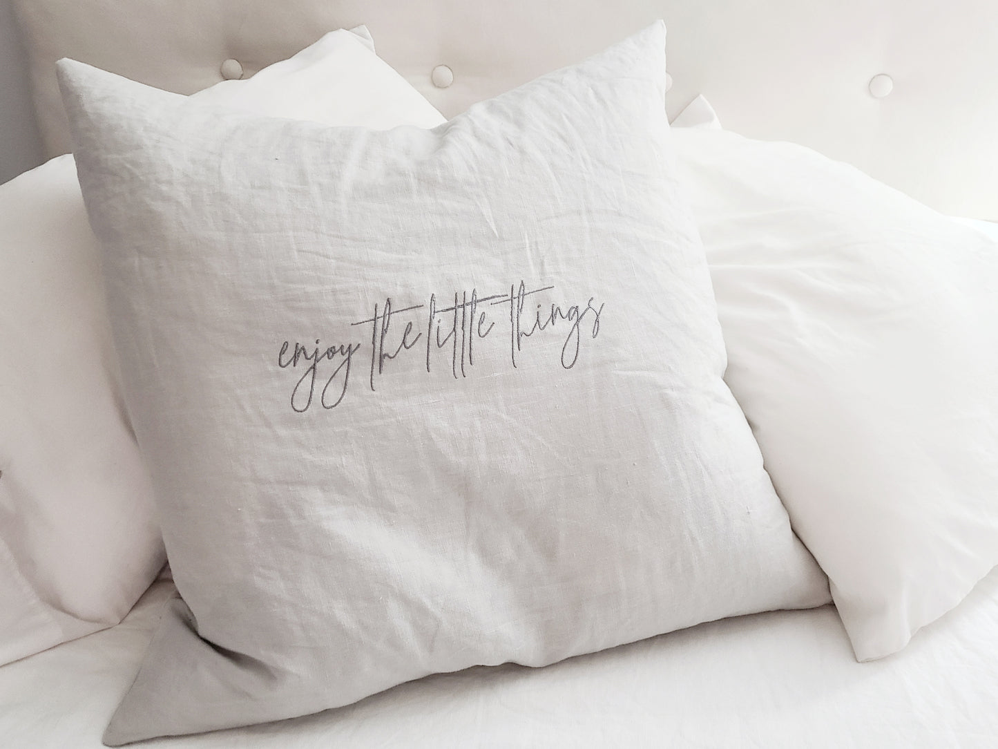 Enjoy the little things linen pillow. 24"x24" Available in 3 linen colours. Natural, Dove grey or white linen. 3 insert choices available. Feather insert (shown in picture), polyester insert, no insert.