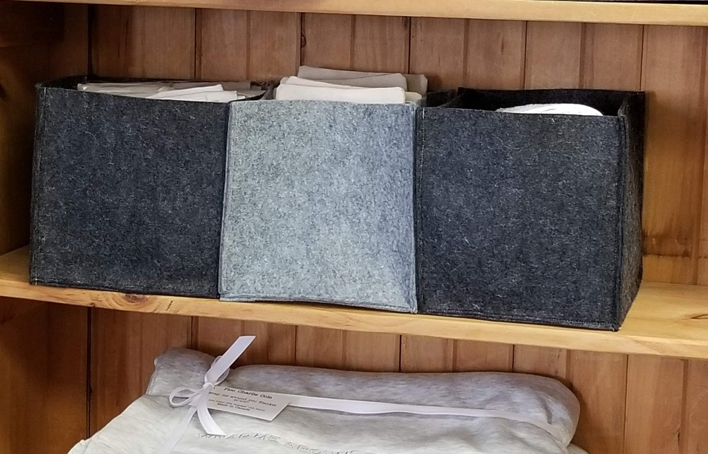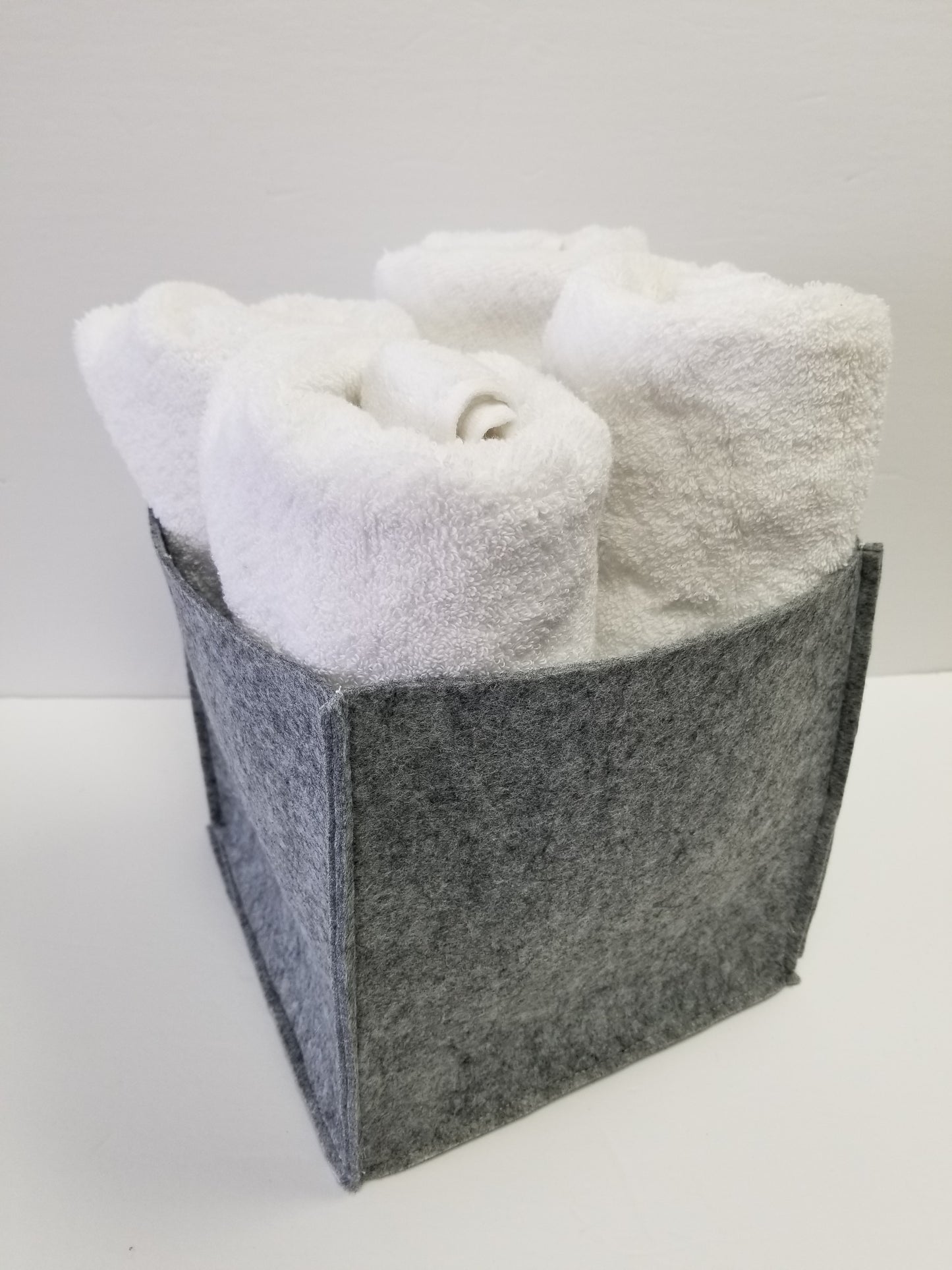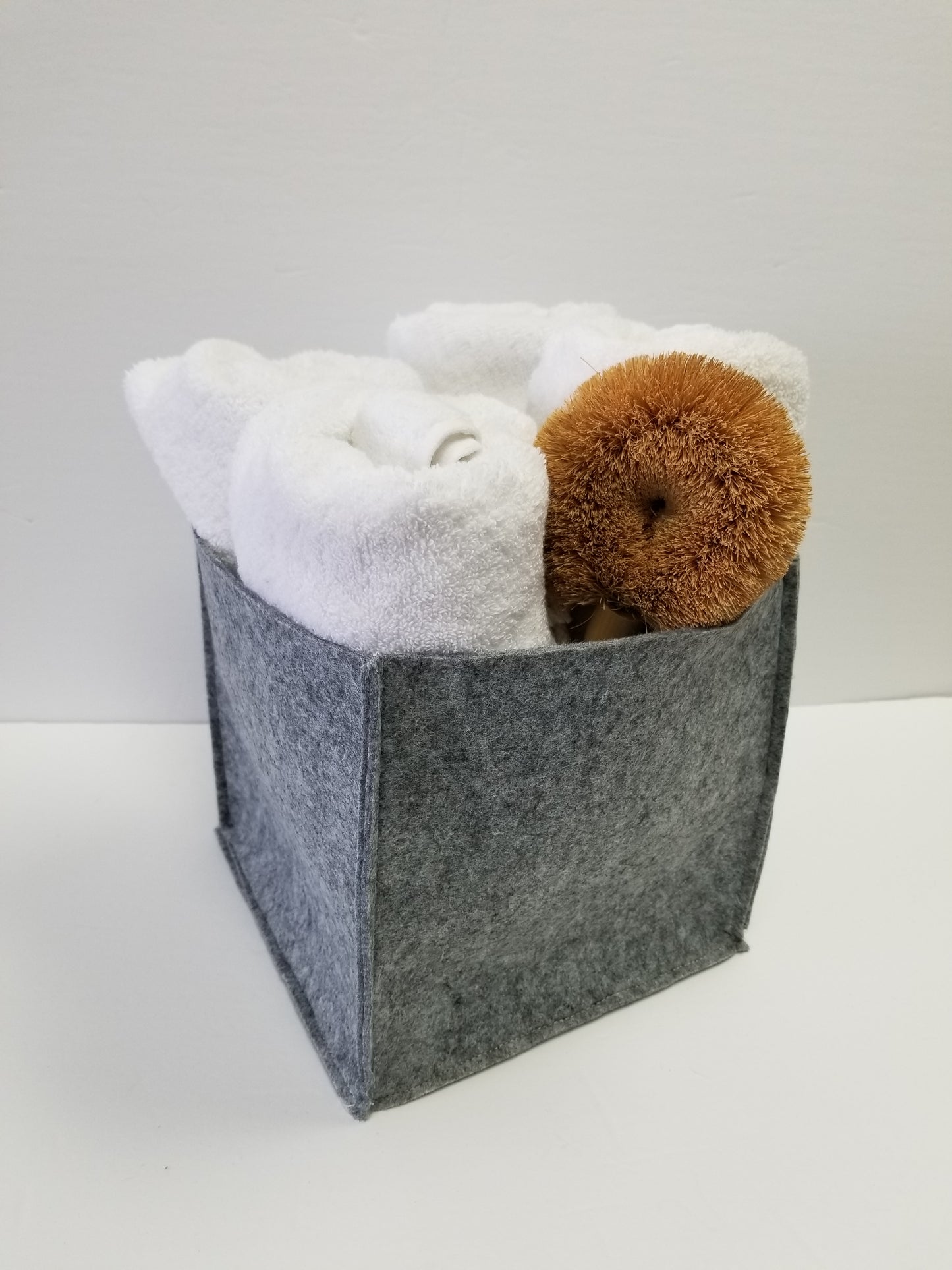 A sturdy upright mini storage box that hold quite a bit. This felt bin holds its shape and is wonderful for organizing one's space.