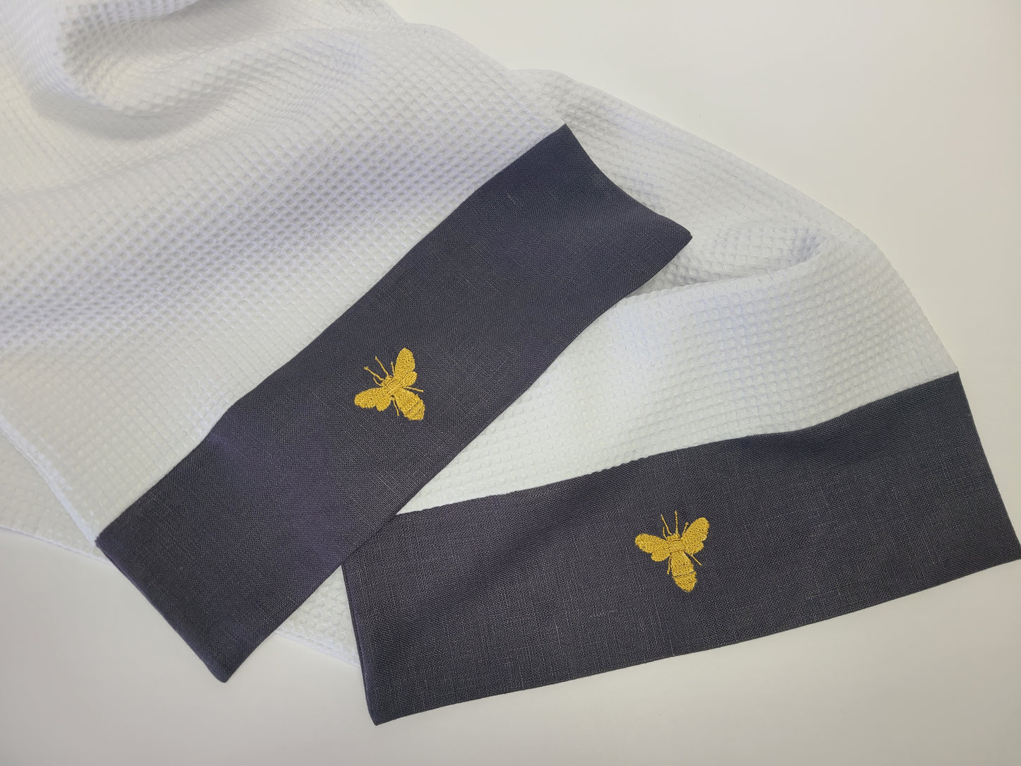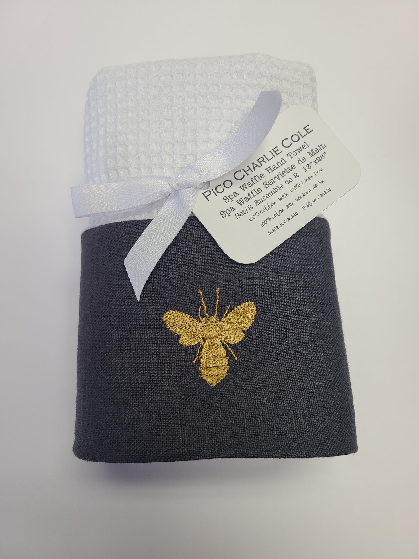 Indulge in luxury with our White Bee Spa Waffle Hand Towel Set of 2. The spa waffle fabric is designed to add a touch of relaxation to your daily routine while the charcoal linen border and embroidered bee add a charming touch. Perfect for pampering yourself or as a unique gift for a friend.