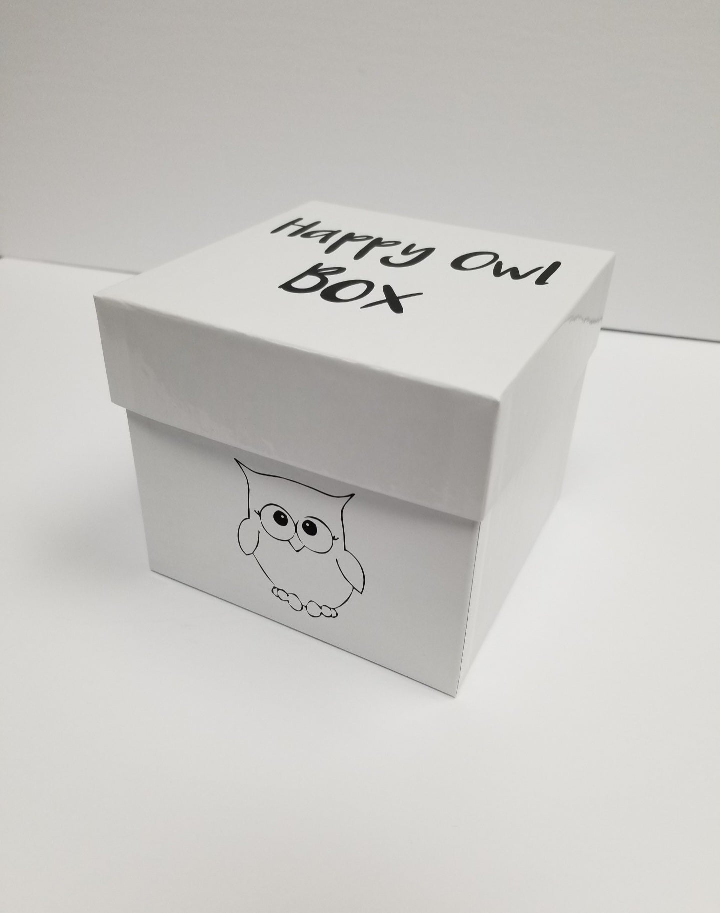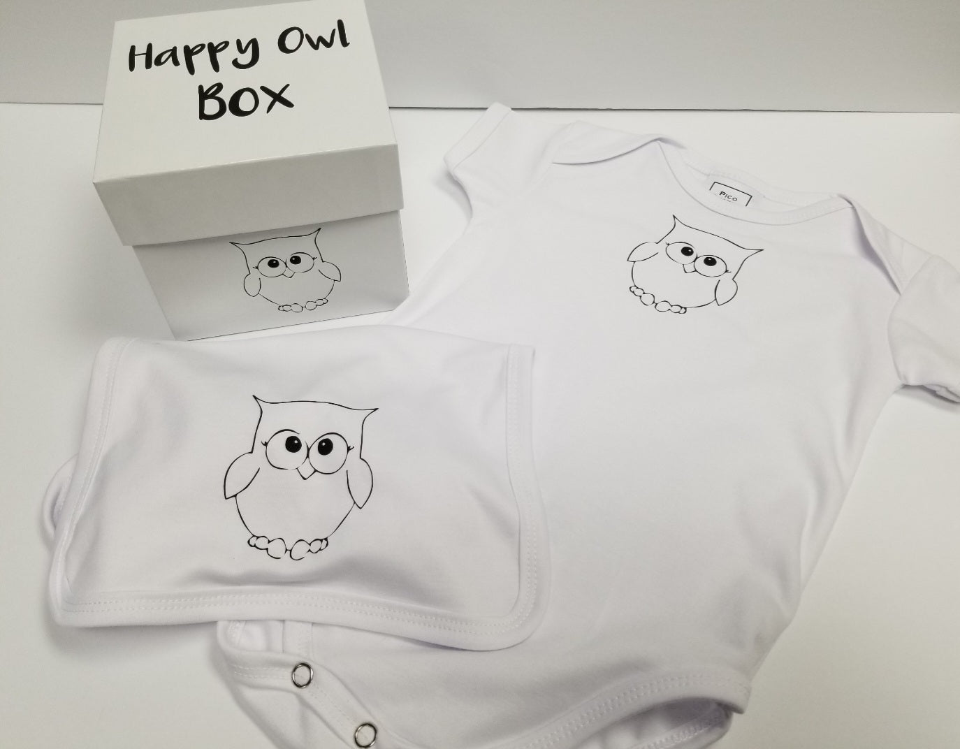 One Piece: 100% Canadian Milled Cotton heat pressed with Happy the Owl.