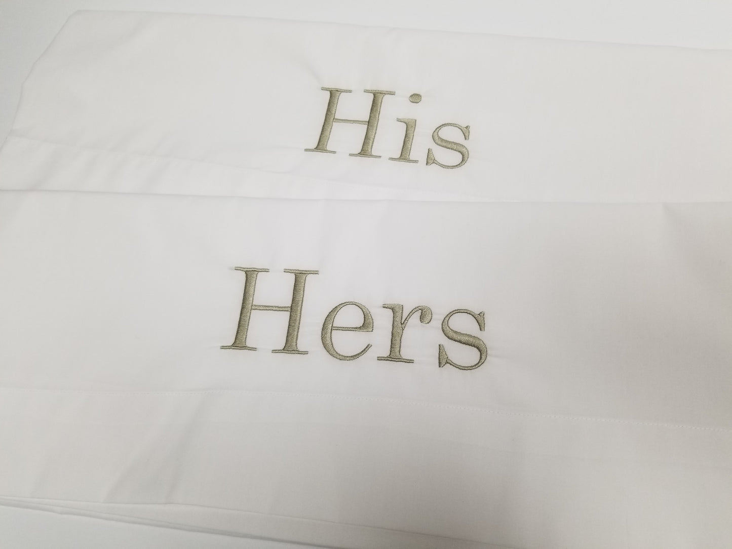 Set of 2 pillowcases embroidered with His on one pillowcase, Hers on the other.