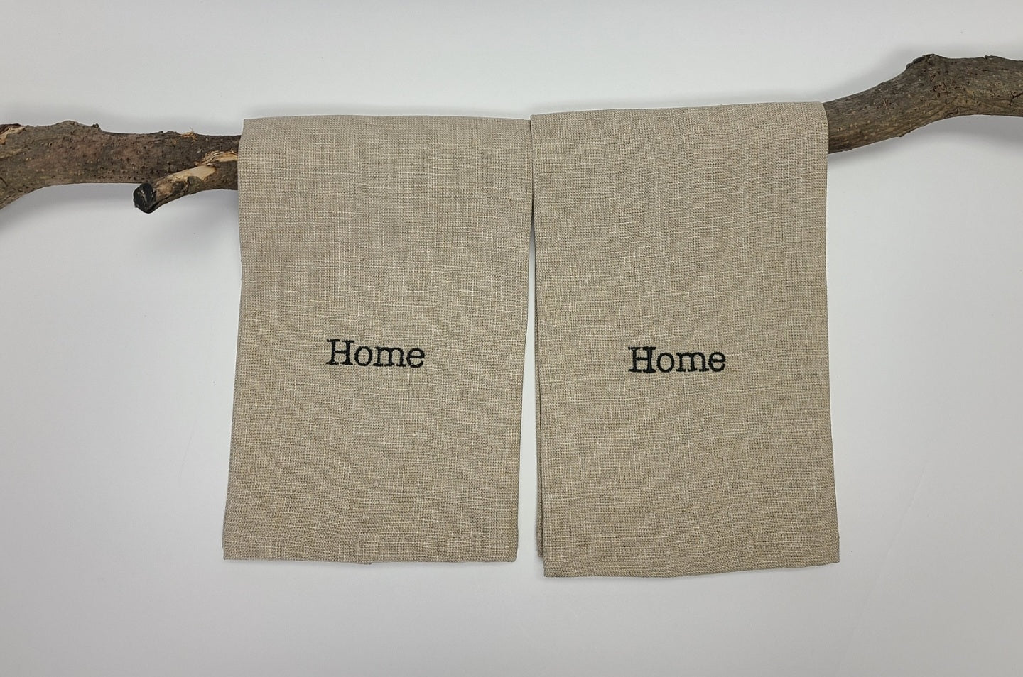 Add a touch of quirkiness to your powder room or guest room with this set of 2 natural linen finger tip towels. Embroidered with "HOME" in black, these towels add a playful touch to your bathroom. Perfect for layering over terry towels, they are both stylish and functional.