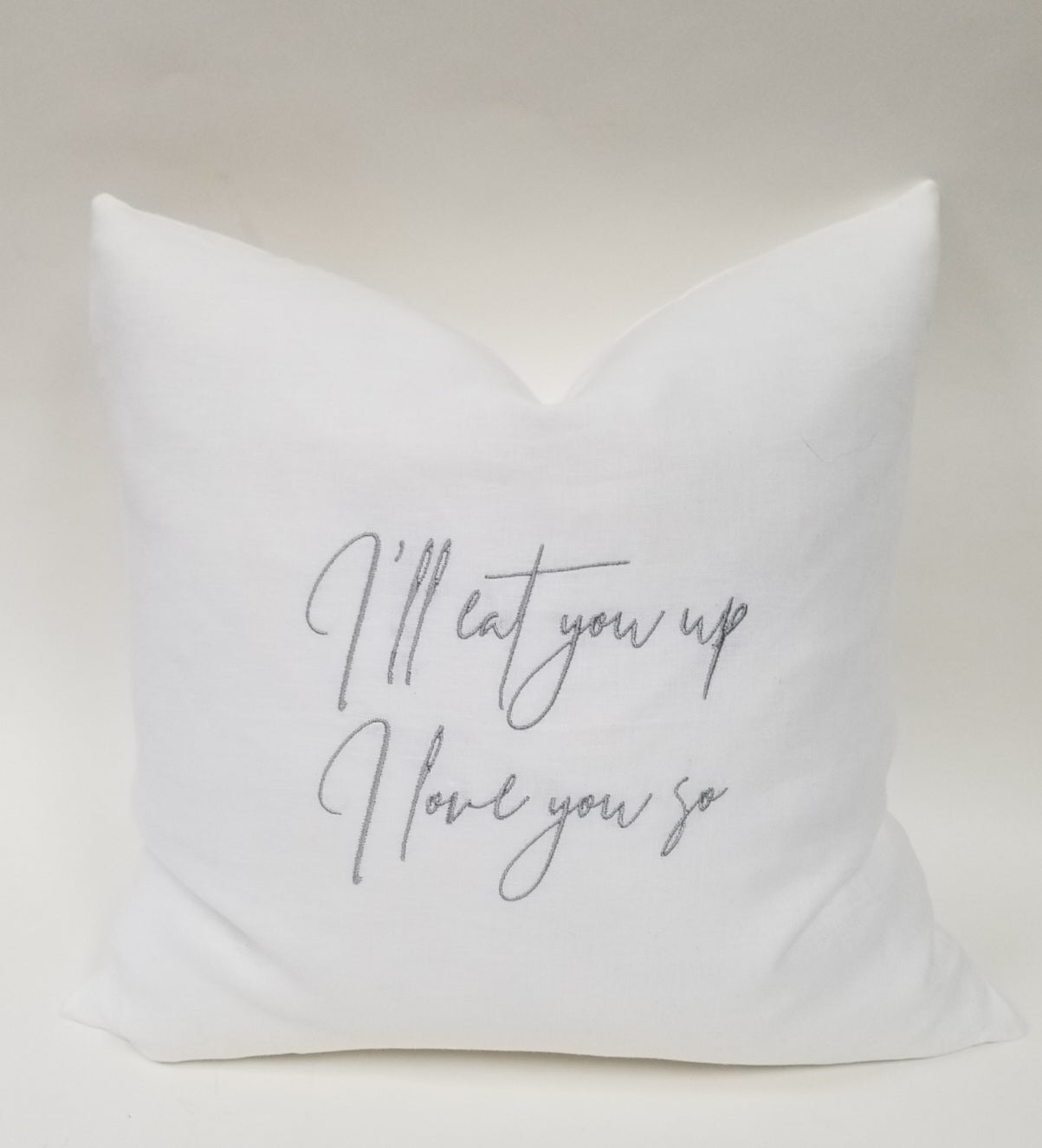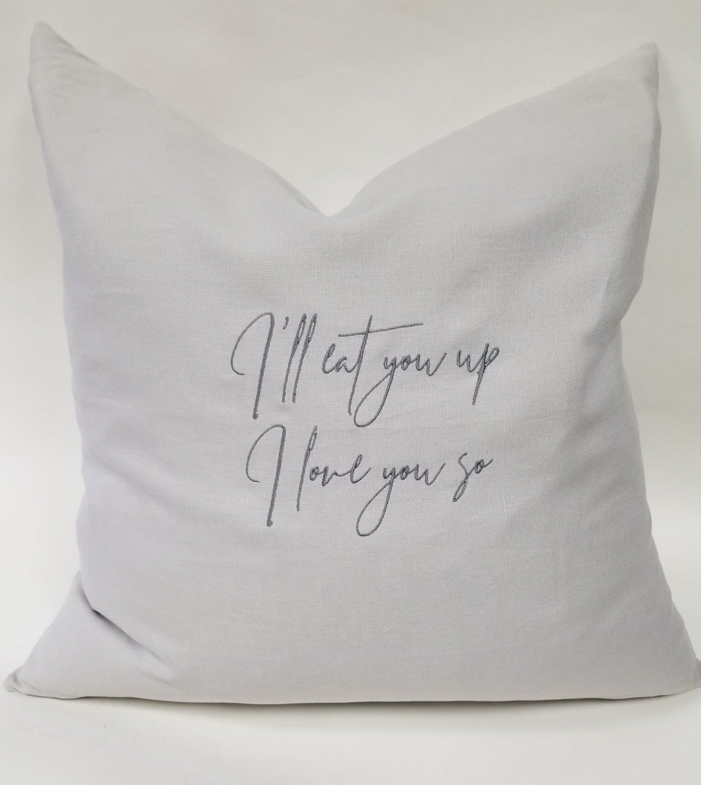 I'll eat you up I love you so linen pillow. 24"x24" Available in 3 linen colours. Natural, white, dove grey. 3 insert choices available. Feather insert (shown in picture), polyester insert, no insert.