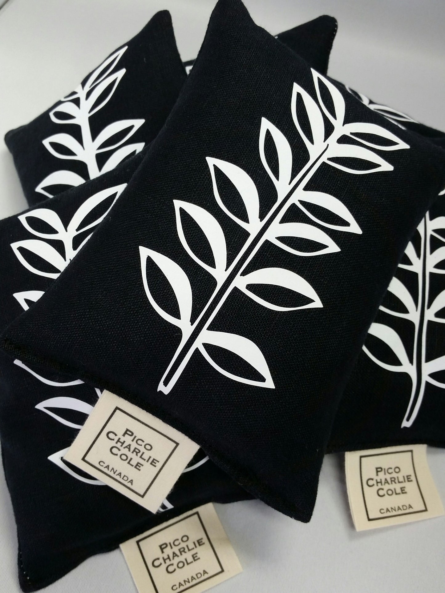 Keep your clothes smelling fresh and fragrant with this stylish Leaf Lavender Black sachet. The black linen is decorated with a decorative pinnate leaf design in white, and it's filled with refreshing French lavender. Pop one in your drawers or closet for a pleasantly scented surprise!