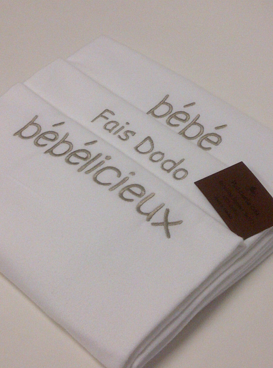 Each embroidered in a satin camel thread. Bebe, Fais Dodo & Bebelicieux.
