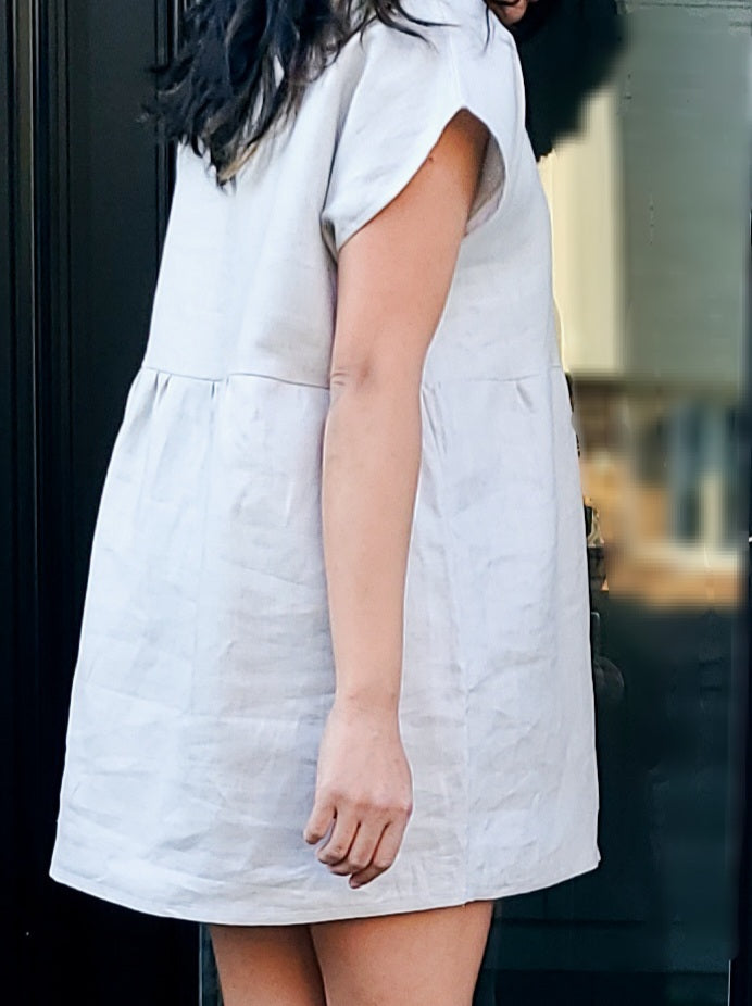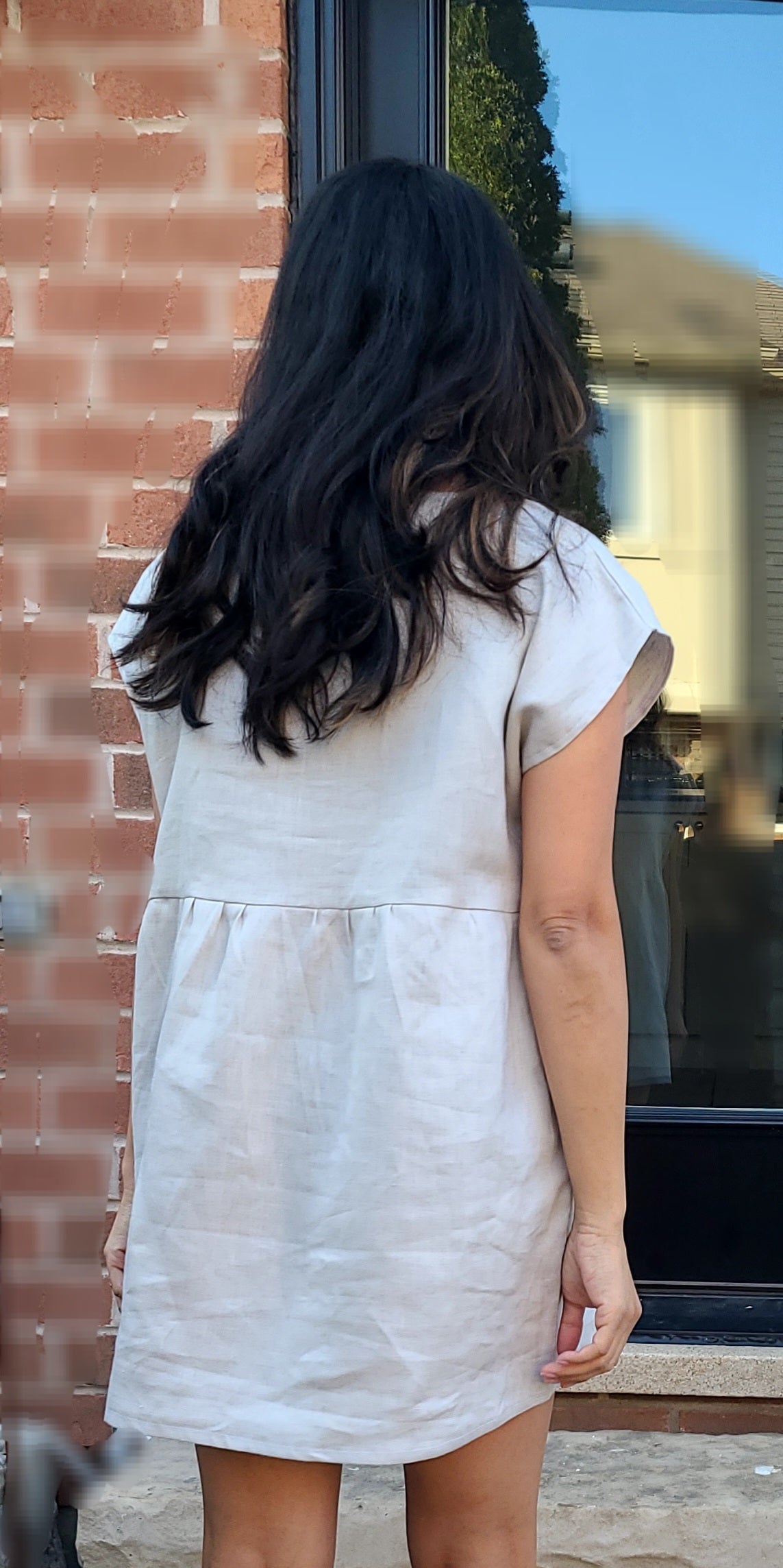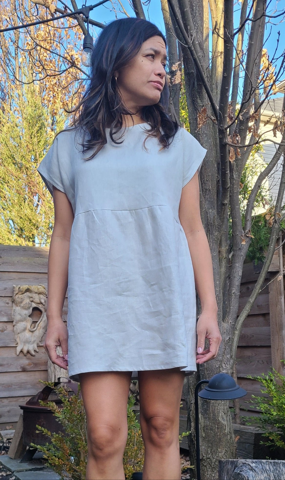 THE LILY linen dress is a light and fun little dress. Over the knee. Scoop neck with a shoulder that gently falls. Wear it as a dress or over tights or jeans.
