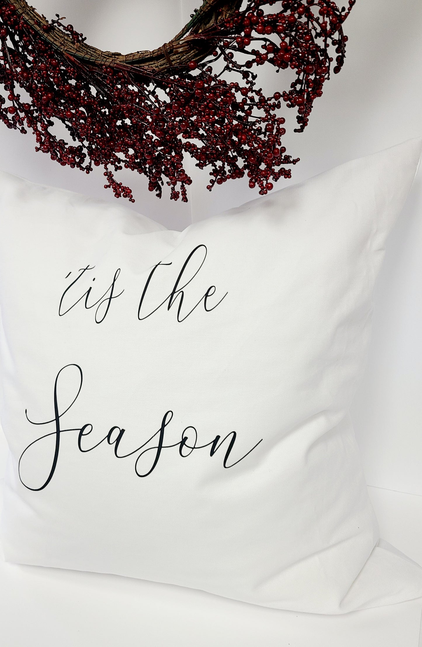 'tis the Season white denim cotton pillow. Feather filled plush pillow. Pillow is heat pressed in black.