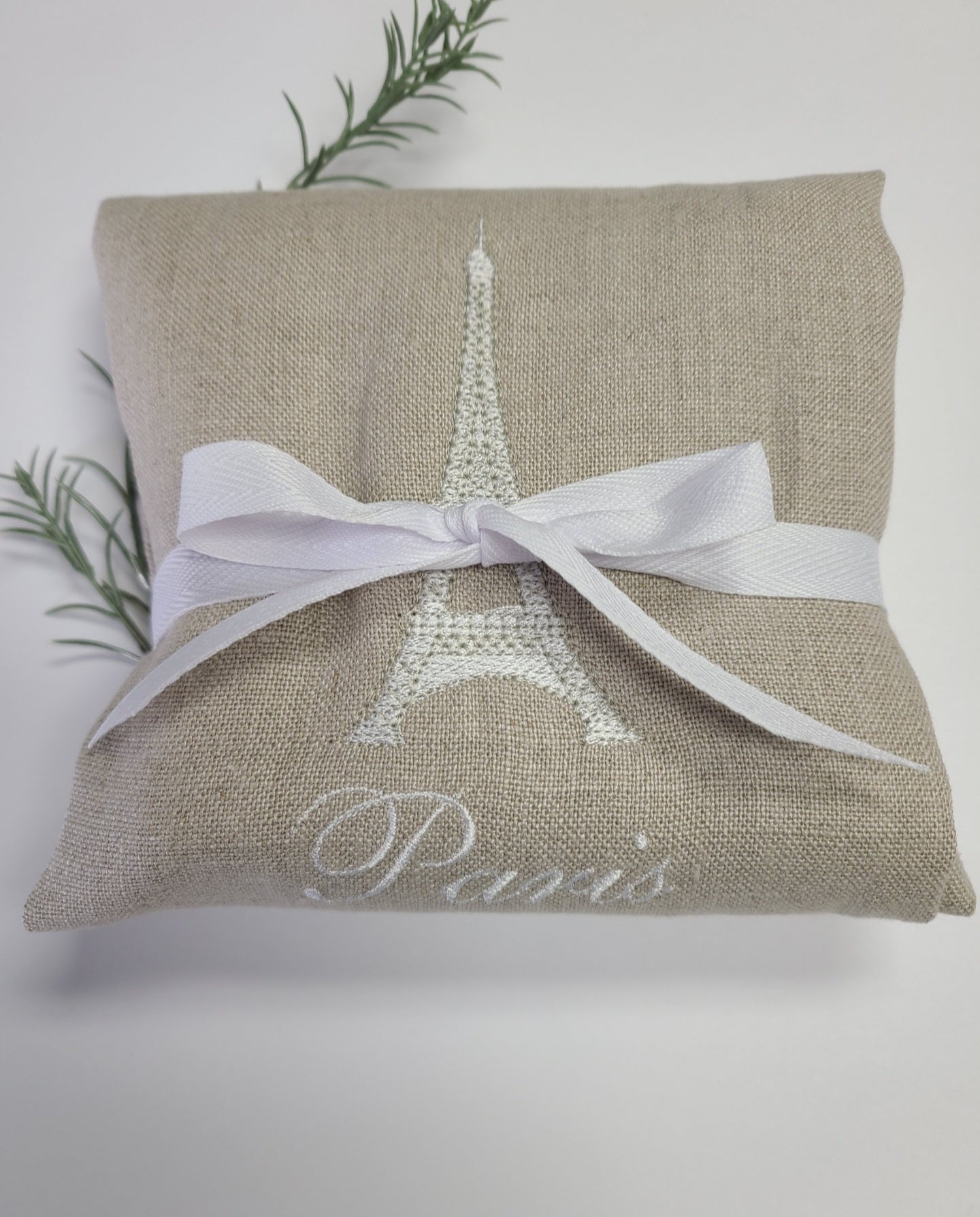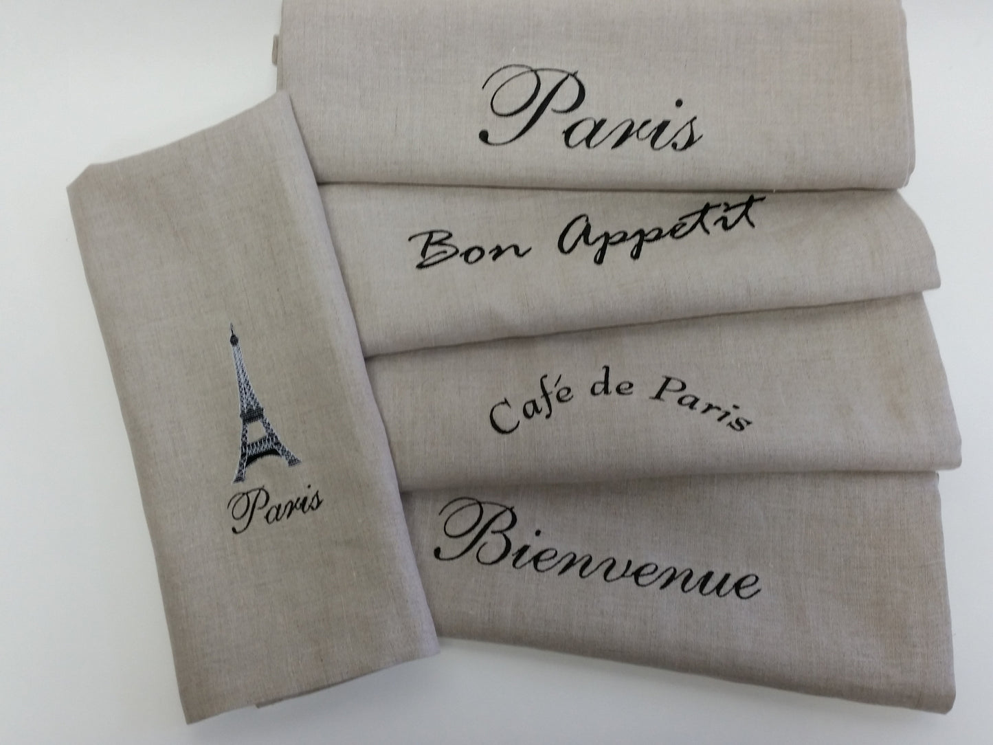A natural Linen tea towel embroidered with "100% Linen" in black thread.