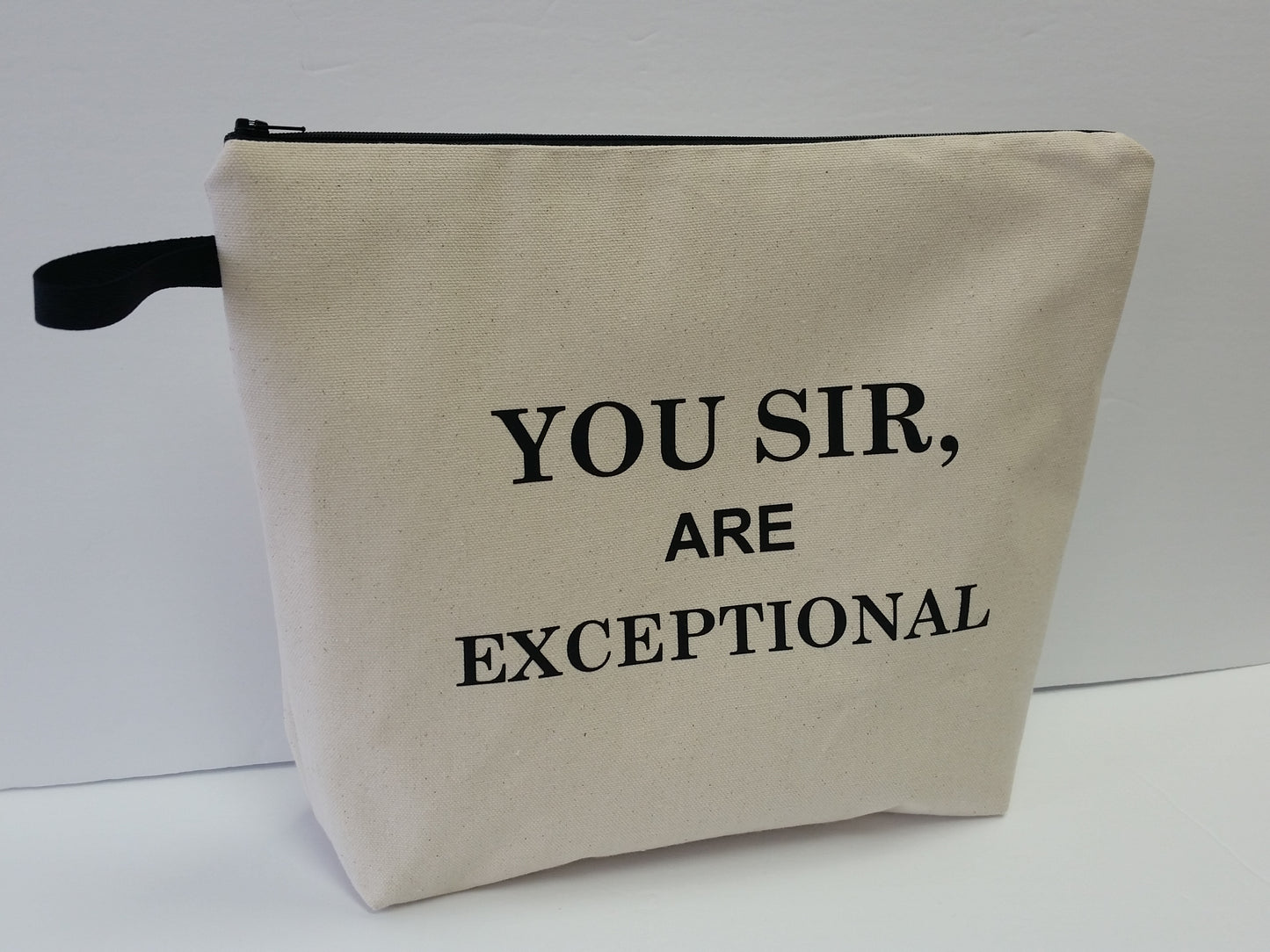 You Sir are Exceptional toiletry, wash bag. Made from an organic cotton canvas exterior and and organic cotton canvas interior. Great for storing anything. Heat pressed in black. Generous size. Contents not included.