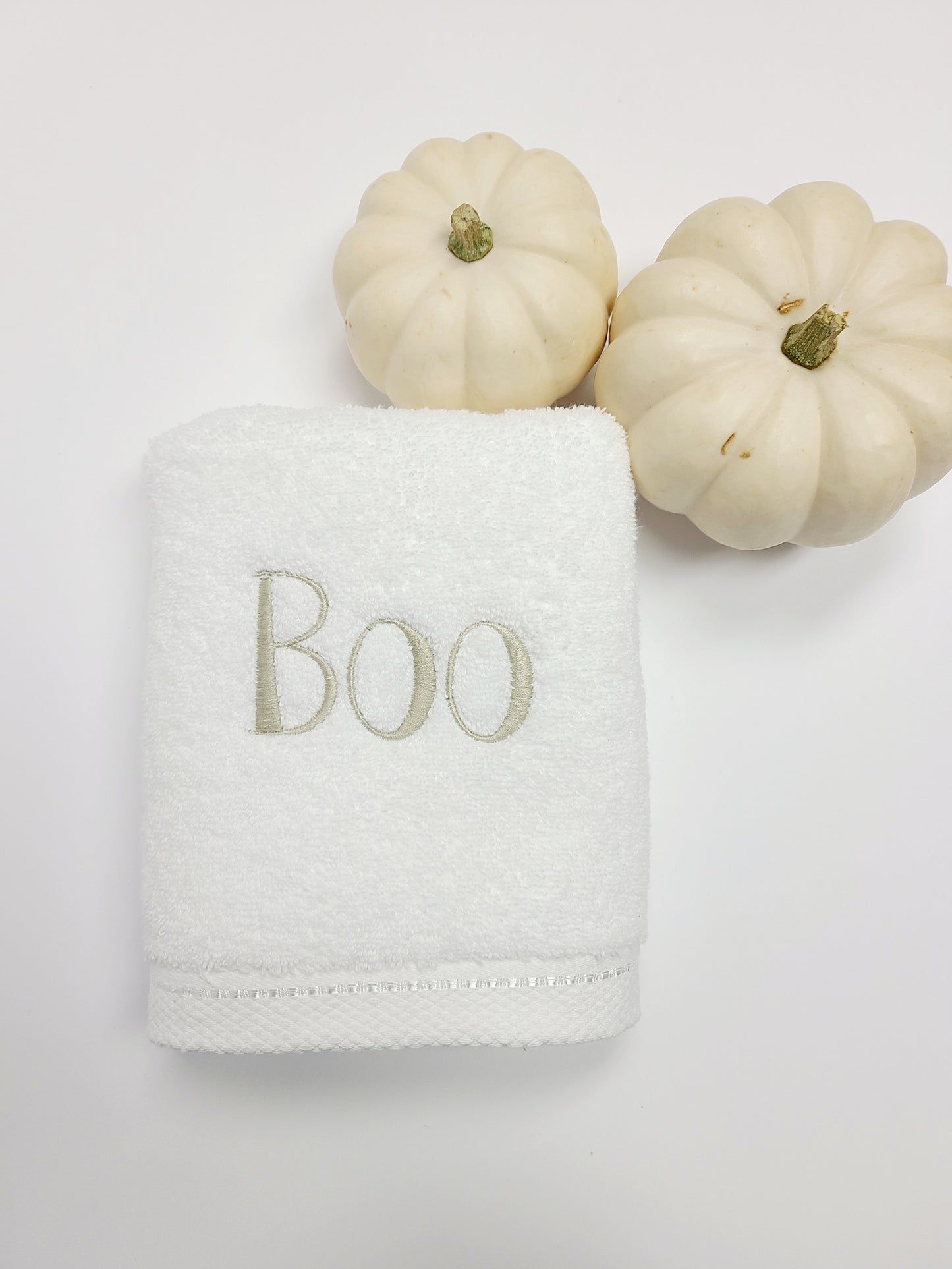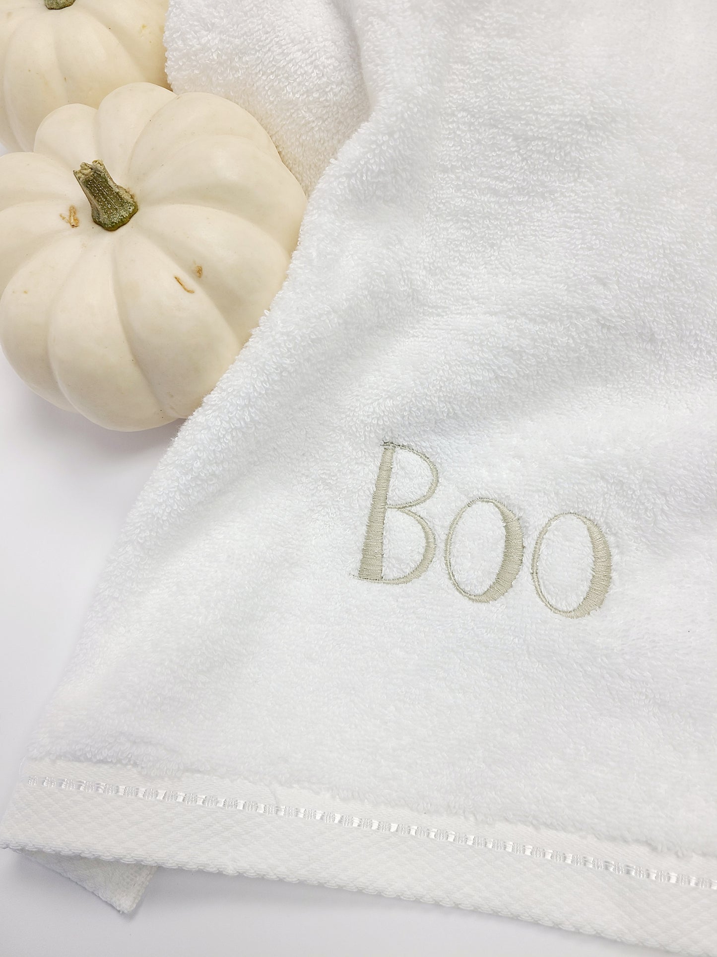 Boo Embroidered hand towel. Whether you're feeling a little spooky or you want to acknowledge that special person- you know, your Boo, this hand towel is for you.