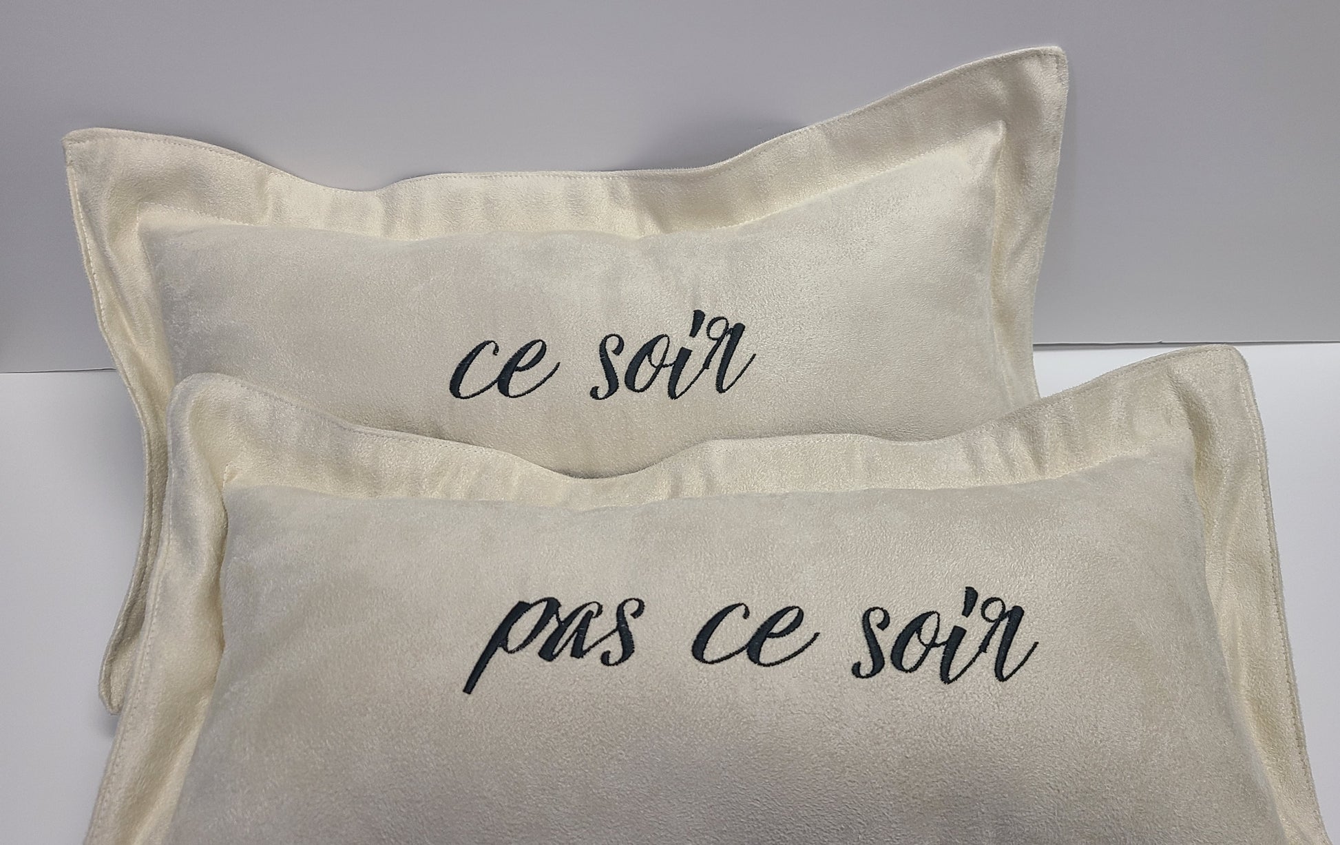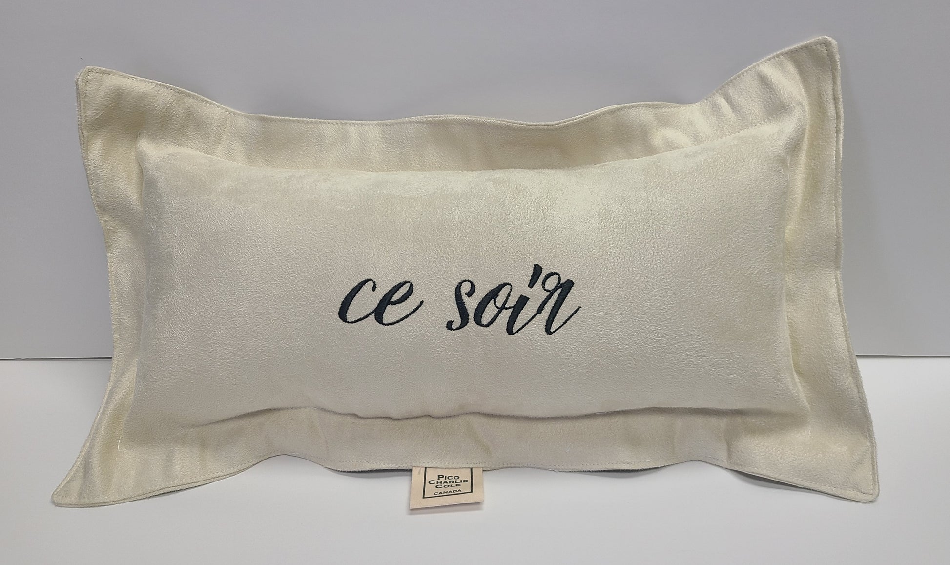 This cheeky mini lumbar pillow speaks volumes without saying a word! Crafted in luxurious ultra suede, it displays "ce soir" on one side and "pas ce soir" on the other (meaning, tonight, not tonight) – the perfect playful way to communicate your mood. Ideal for couples with a sense of humor, this sassy little bedroom accessory adds a touch of fun to your intimate space. No more awkward conversations needed – just flip and let the pillow do the talking!