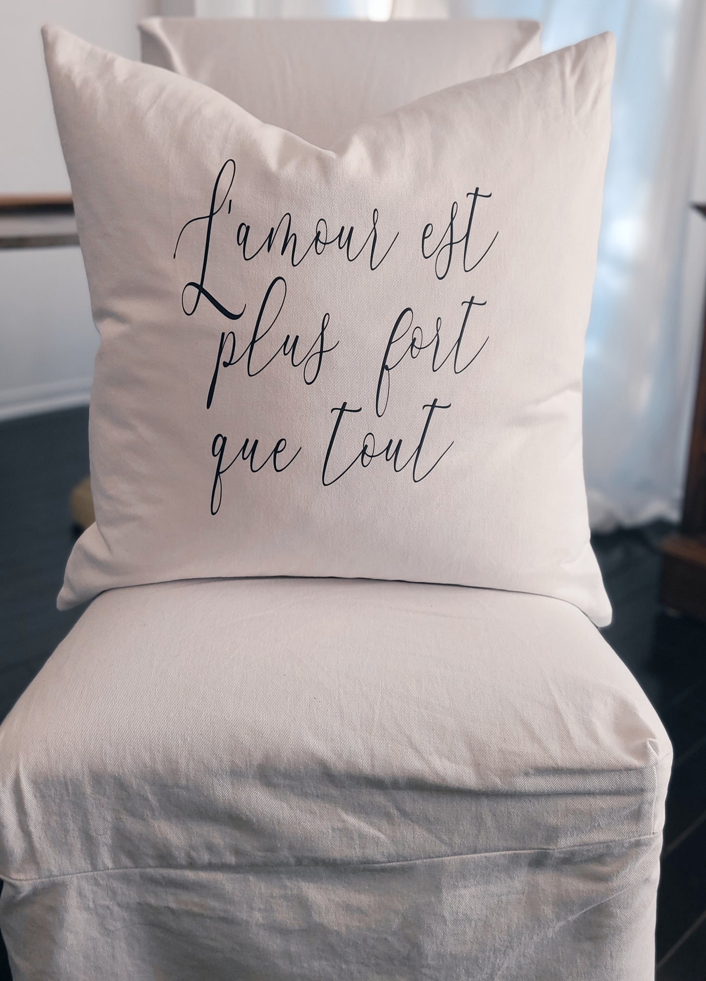L'amour est plus fort que tout white denim cotton pillow. Feather filled plush pillow. Pillow is heat pressed in black.