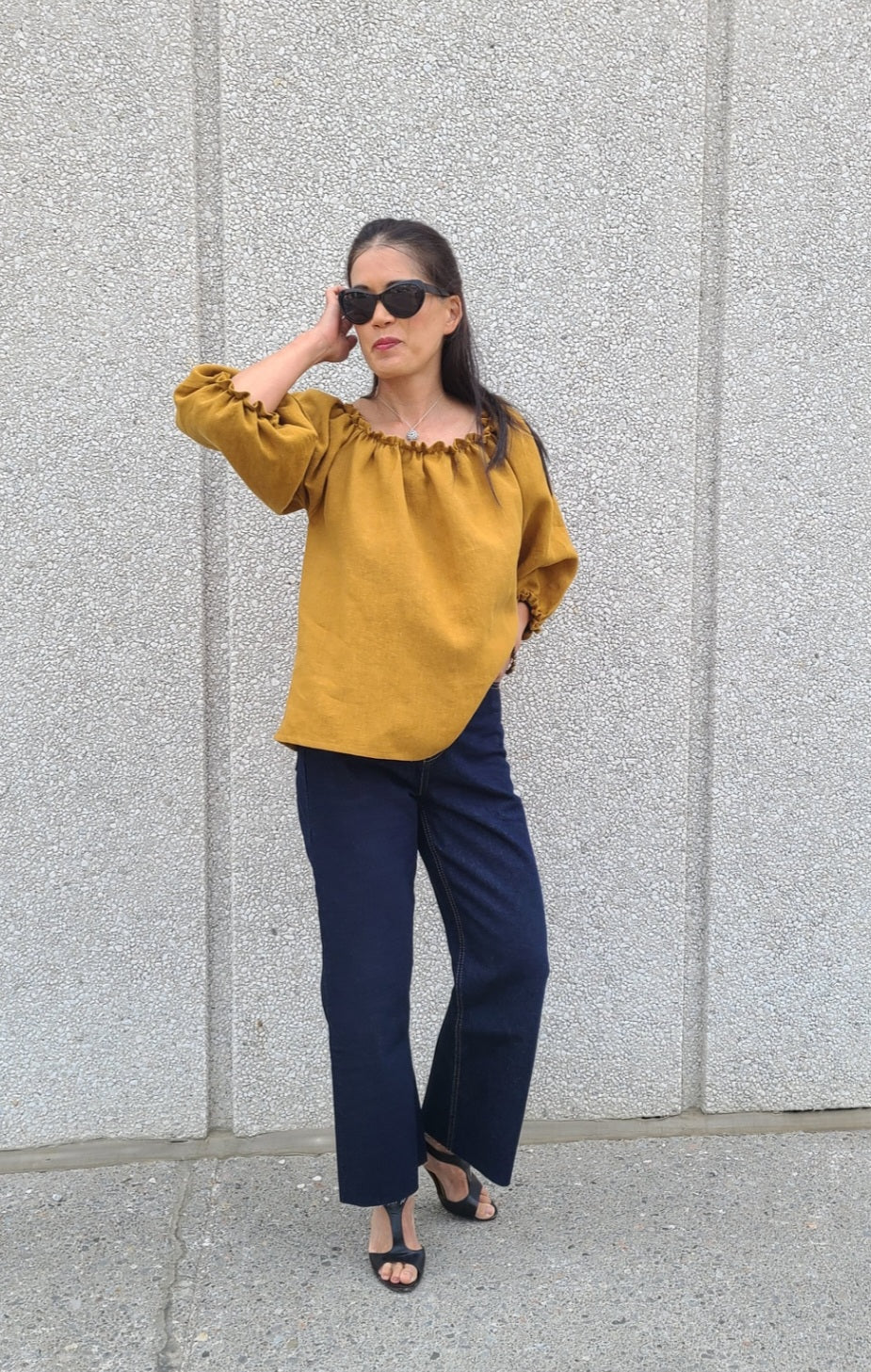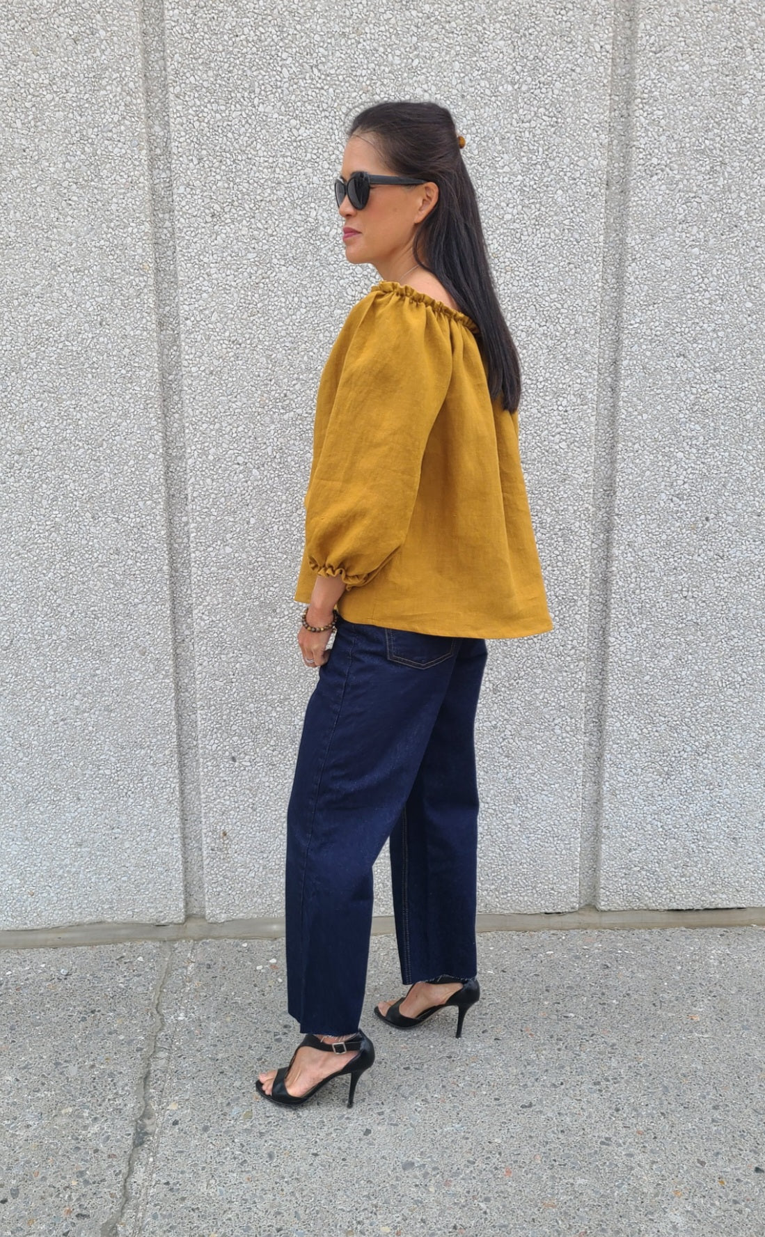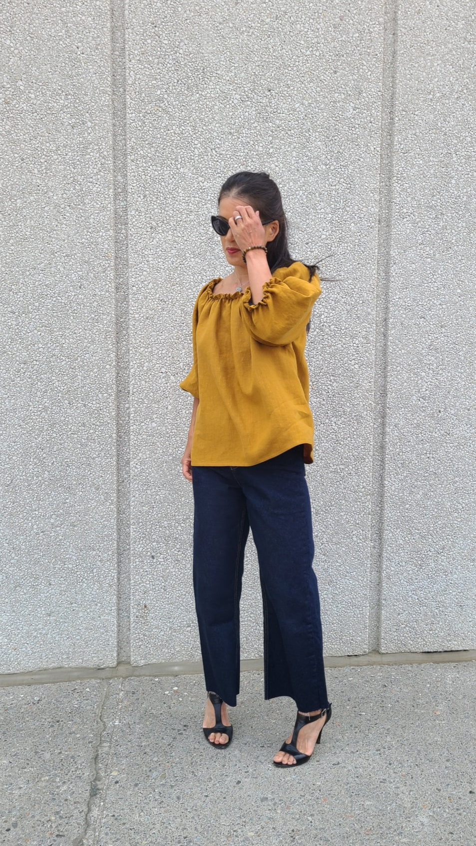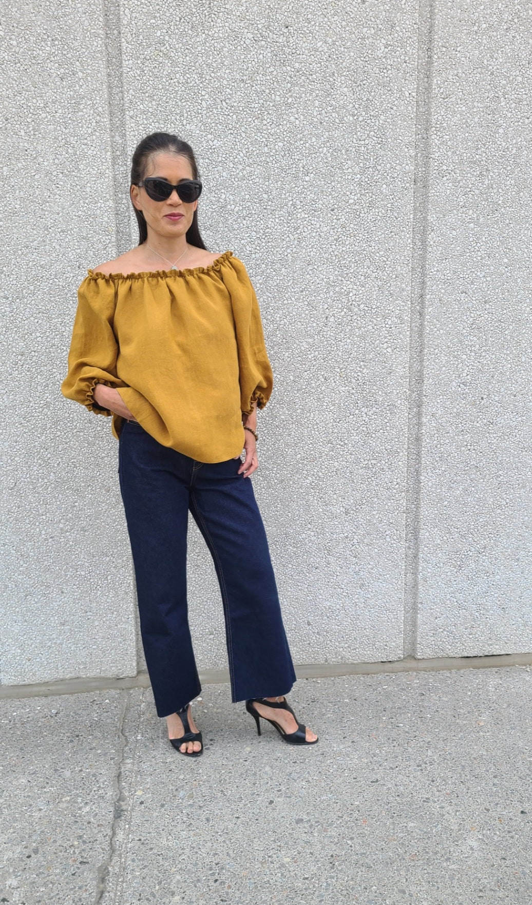 THE MIMI linen top is easy wear. Wear it up and over shoulders or pull it down to show a little shoulder. 3/4 length sleeves with an elastic cuff.