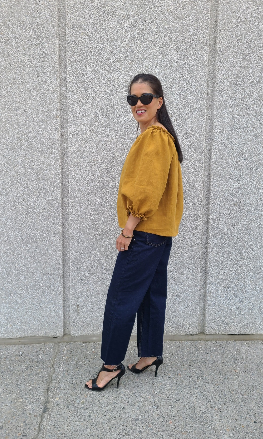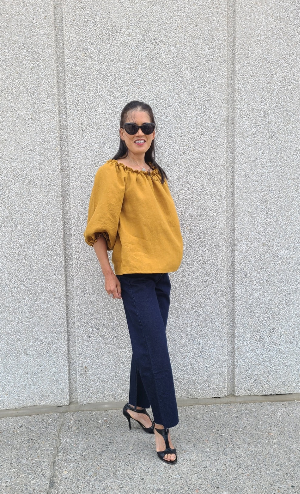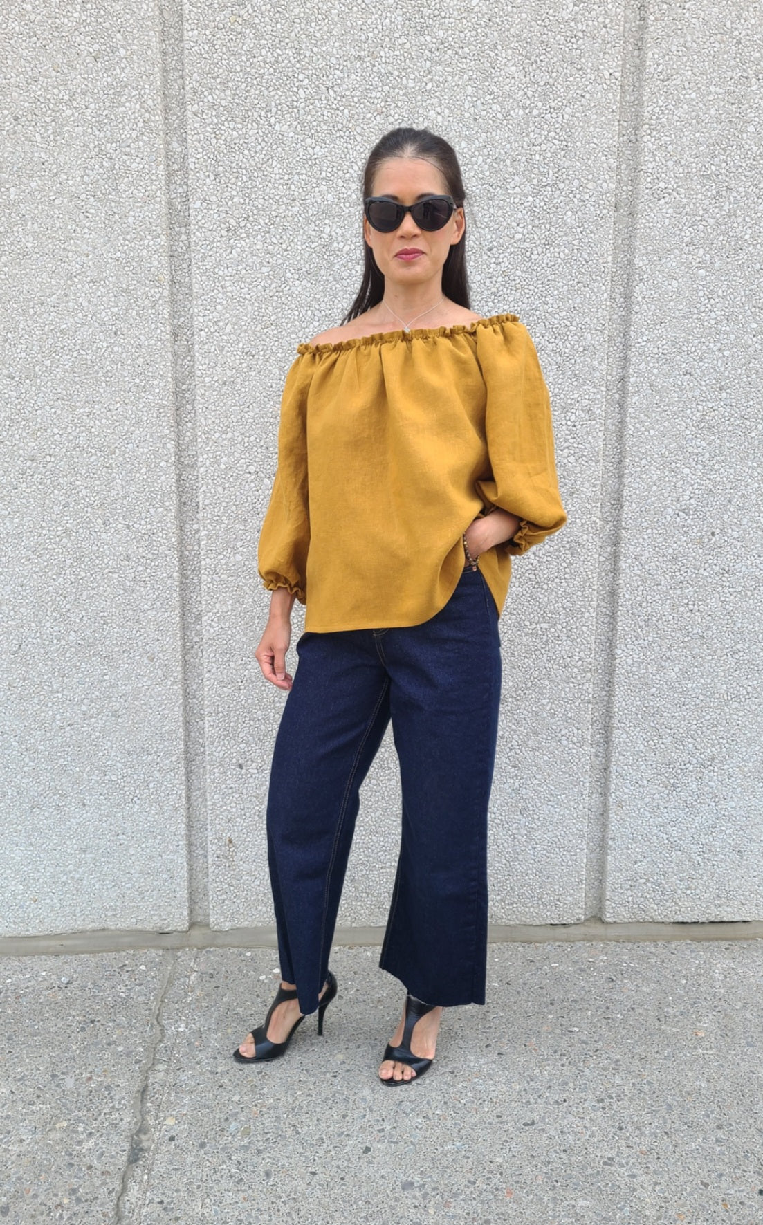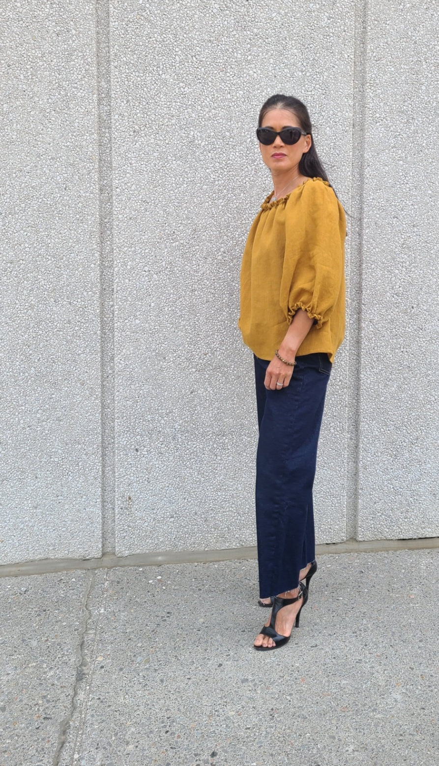 THE MIMI linen top is easy wear. Wear it up and over shoulders or pull it down to show a little shoulder. 3/4 length sleeves with an elastic cuff.