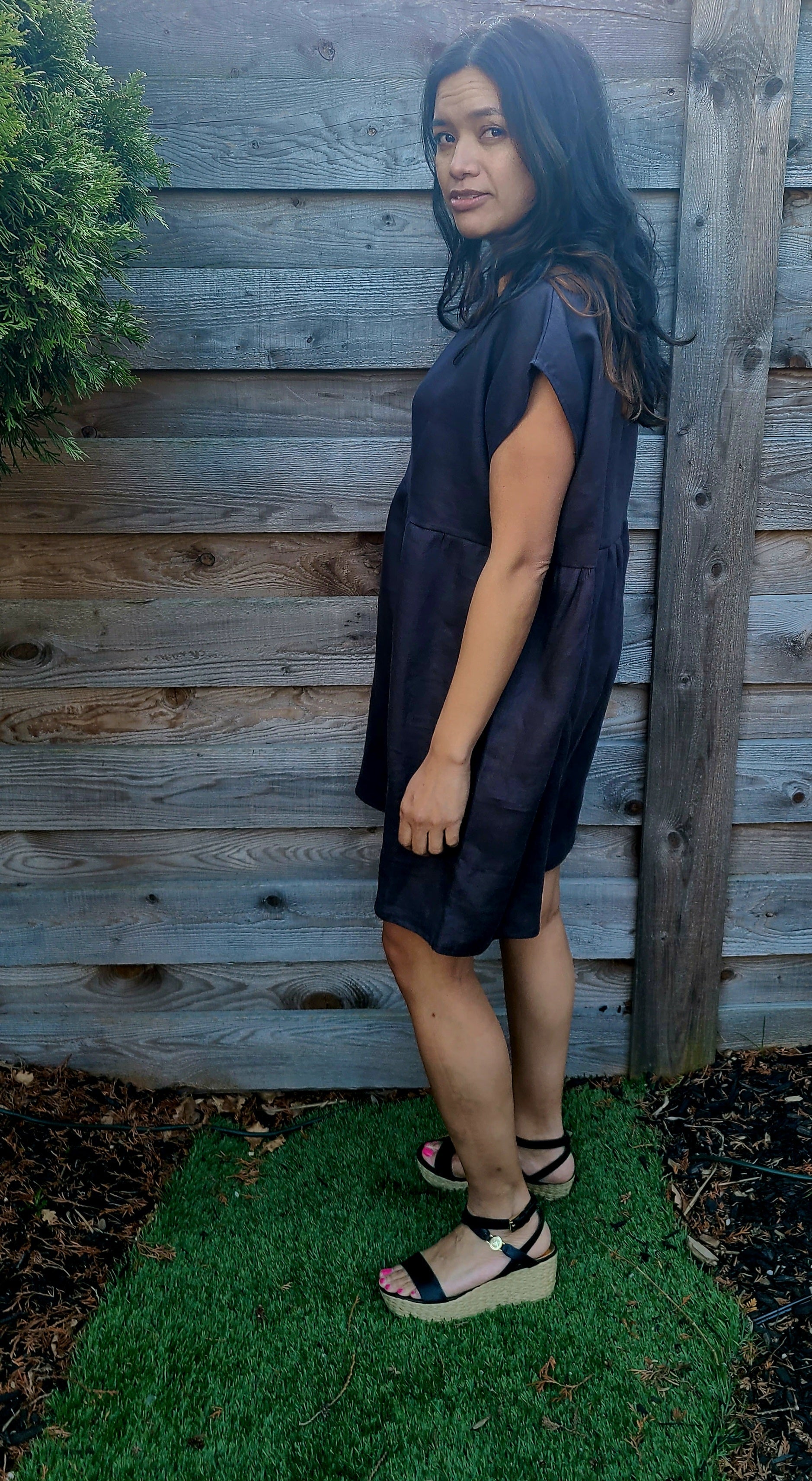 The LILY linen dress is a light and fun little dress. Over the knee with a scooped neck. Wear it as a dress or over tights or jeans.