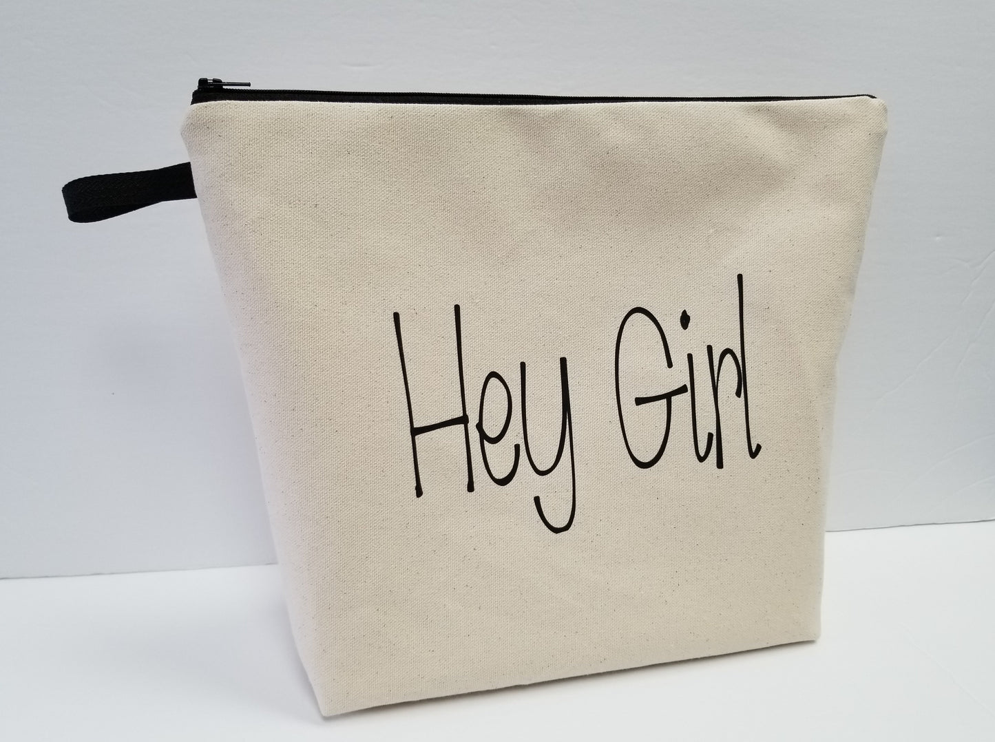 Hey Girl toiletry, wash bag. Made from an organic cotton canvas exterior and and organic cotton canvas interior. Great for storing anything. Heat pressed in black. Generous size.