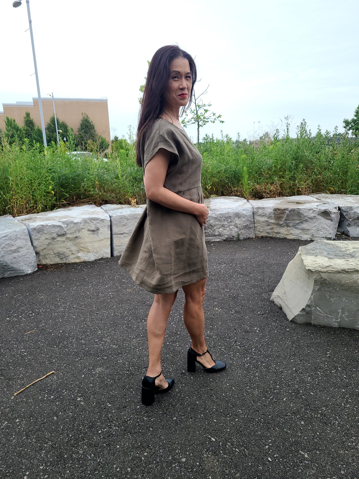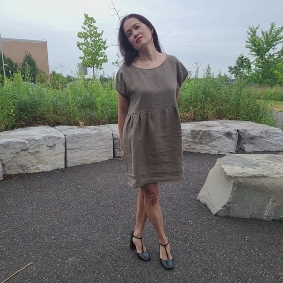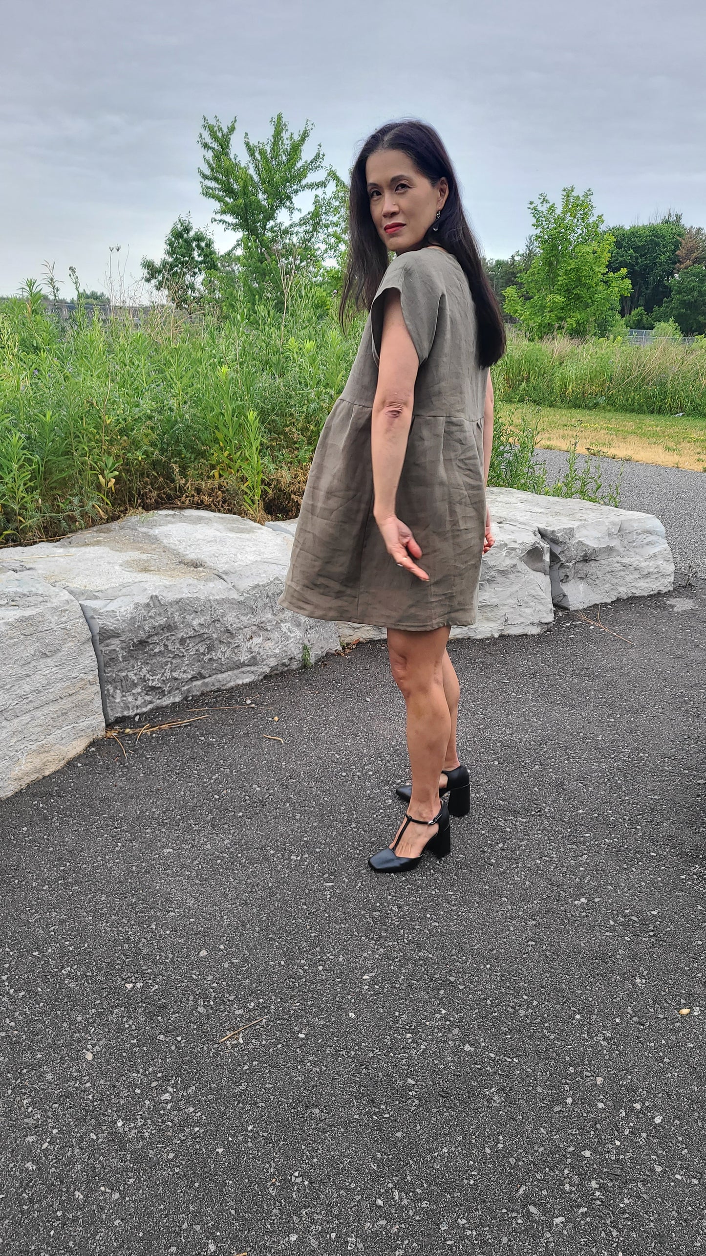 THE LILY linen dress is a light and fun little dress. Over the knee. Scoop neck with a shoulder that gently falls. Wear it as a dress or over tights or jeans.