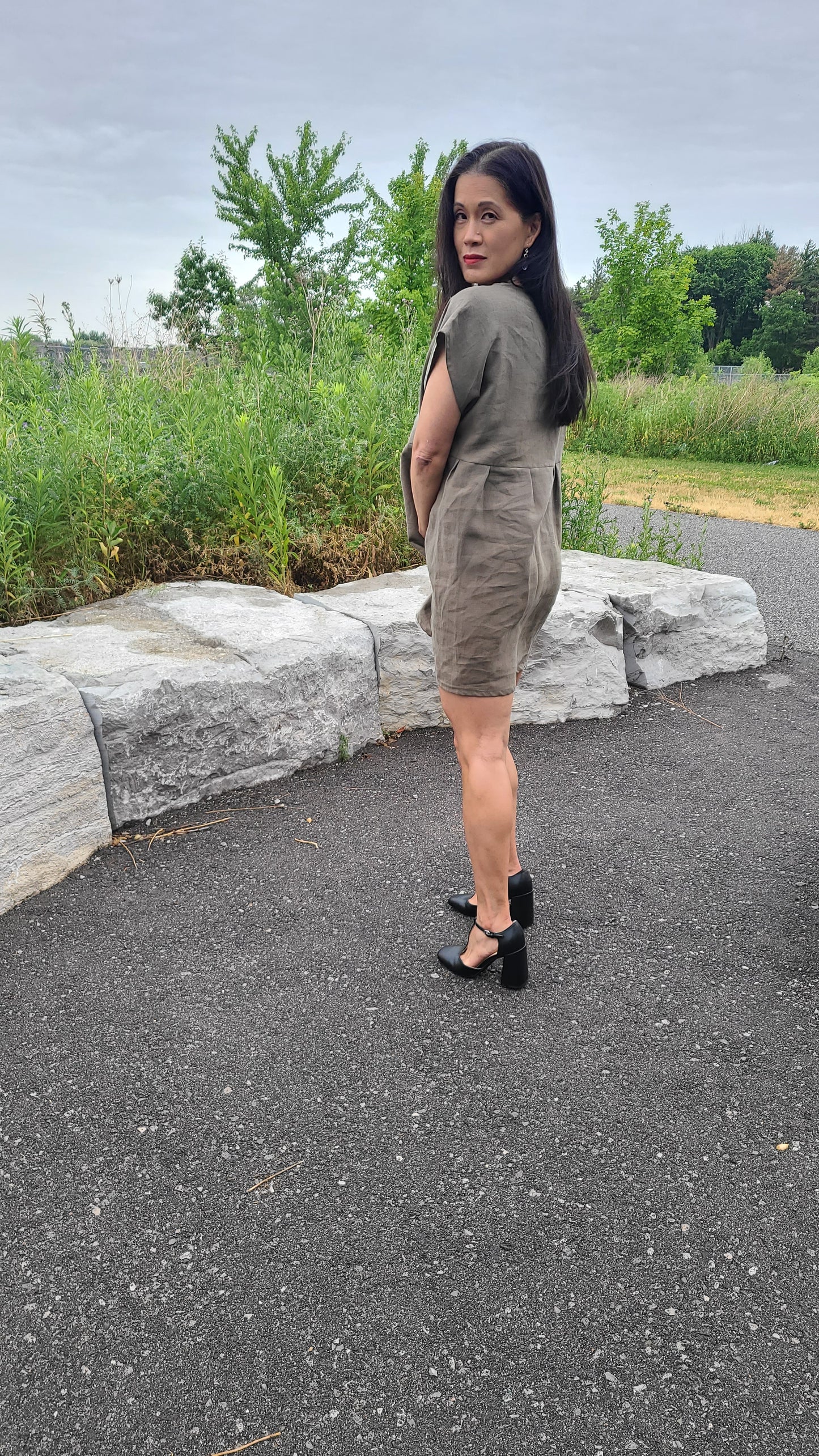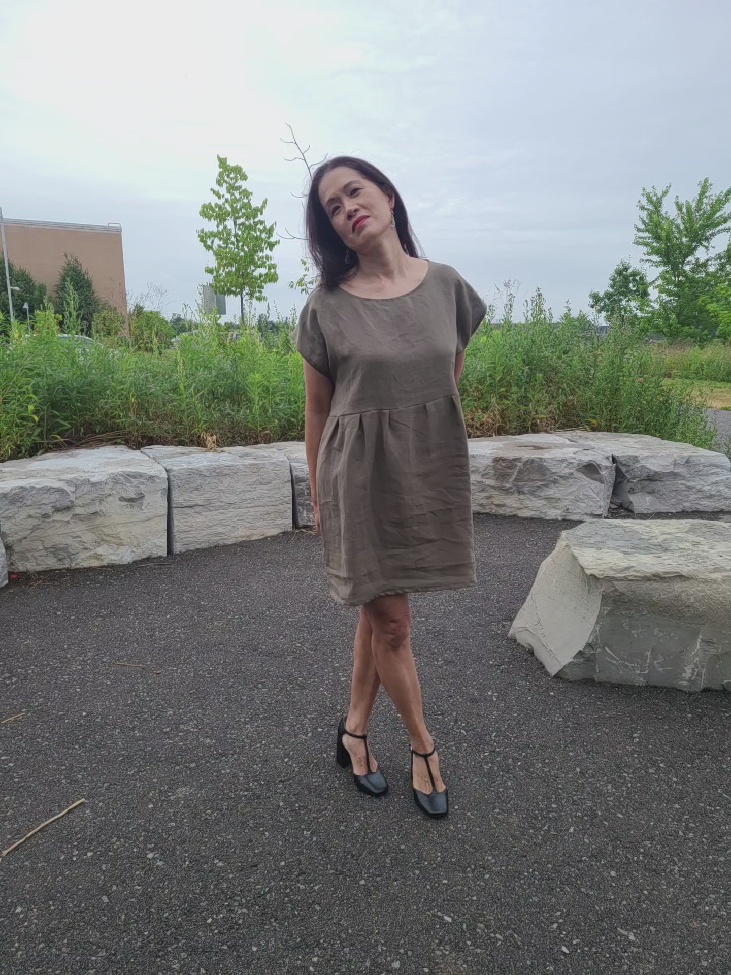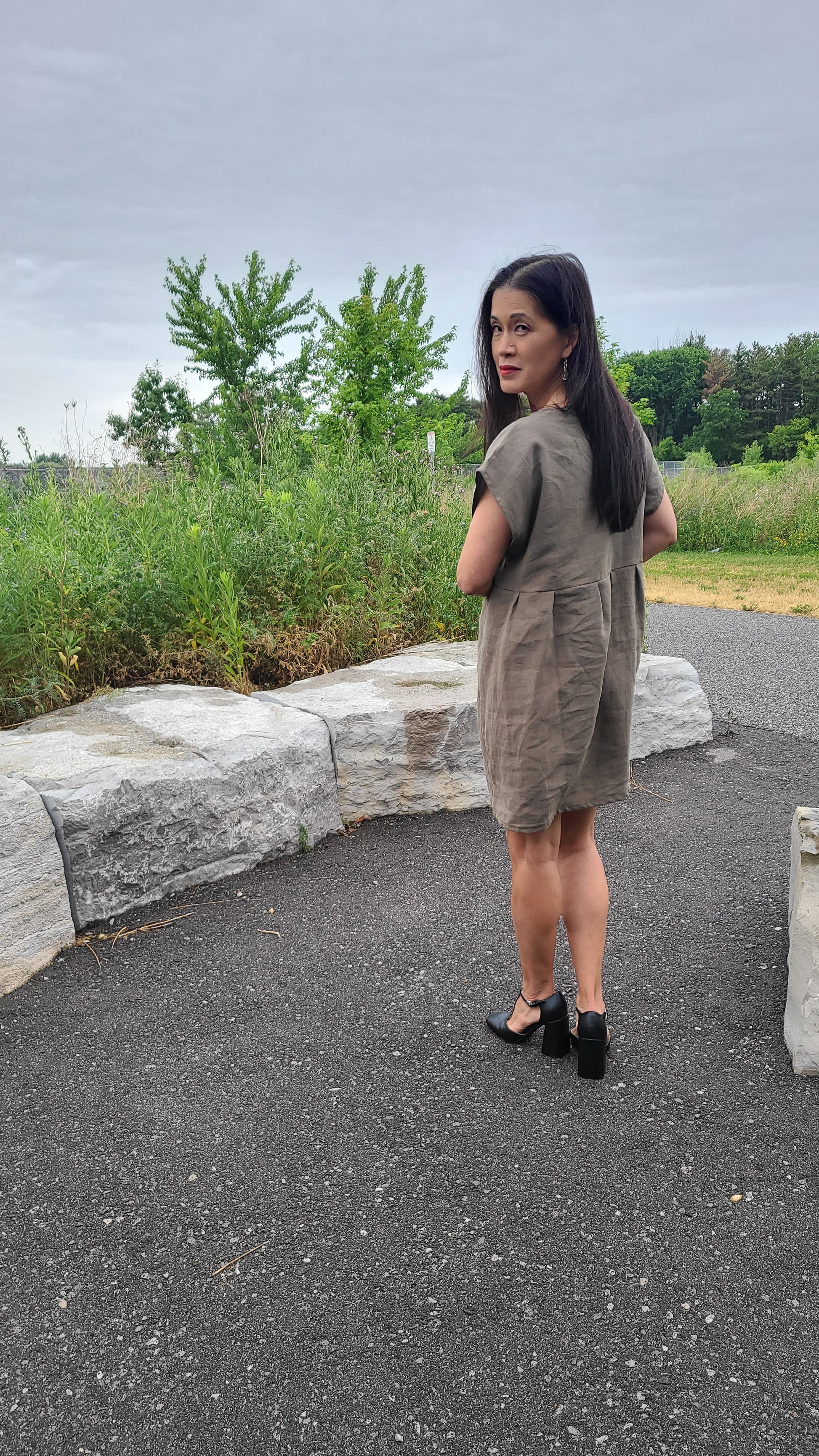 THE LILY linen dress is a light and fun little dress. Over the knee. Scoop neck with a shoulder that gently falls. Wear it as a dress or over tights or jeans.