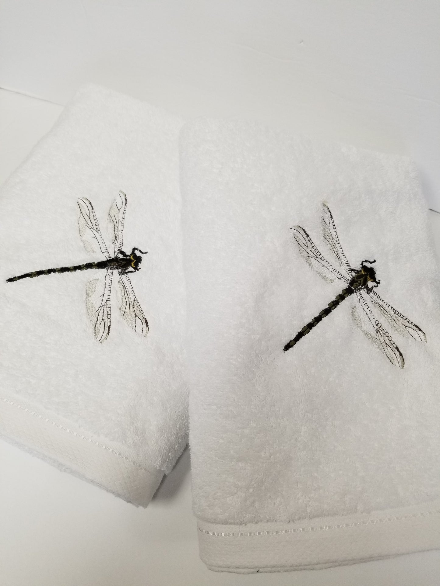 Embroidered dragonfly on a white plush Turkish cotton towel with an elegant Dolby. Set of 2.