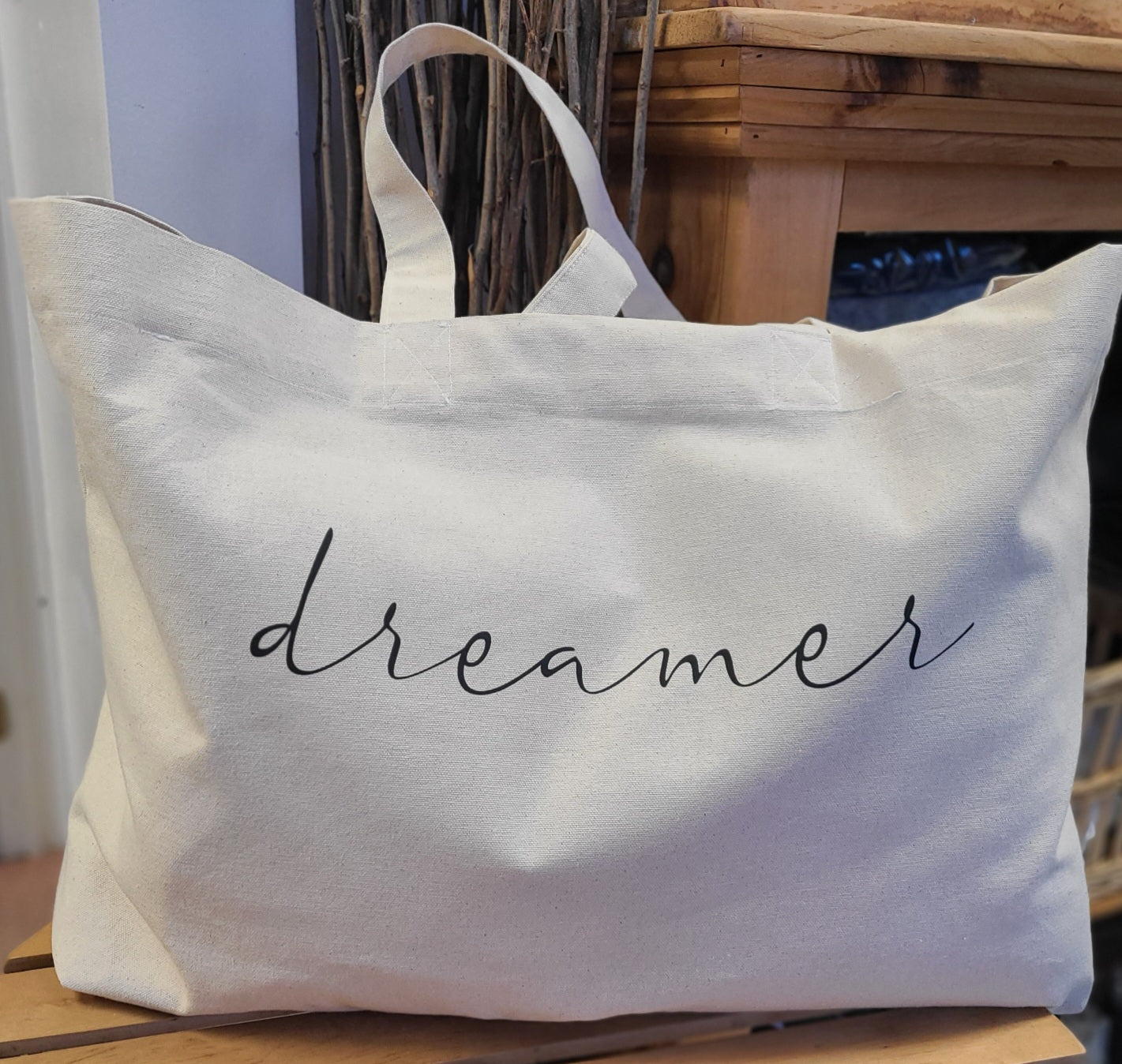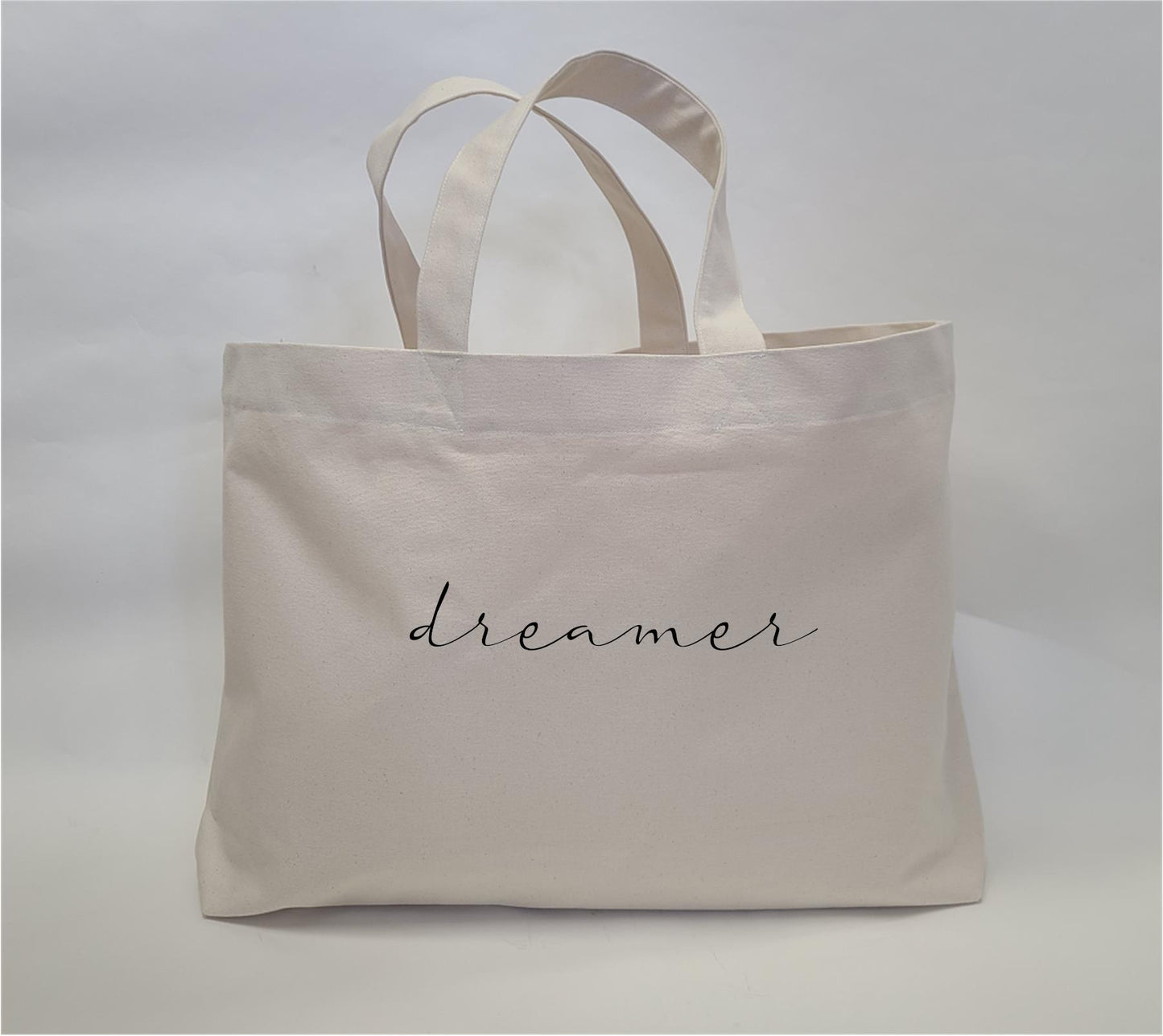 A generous size cotton canvas tote bag. "dreamer" heat pressed in black.