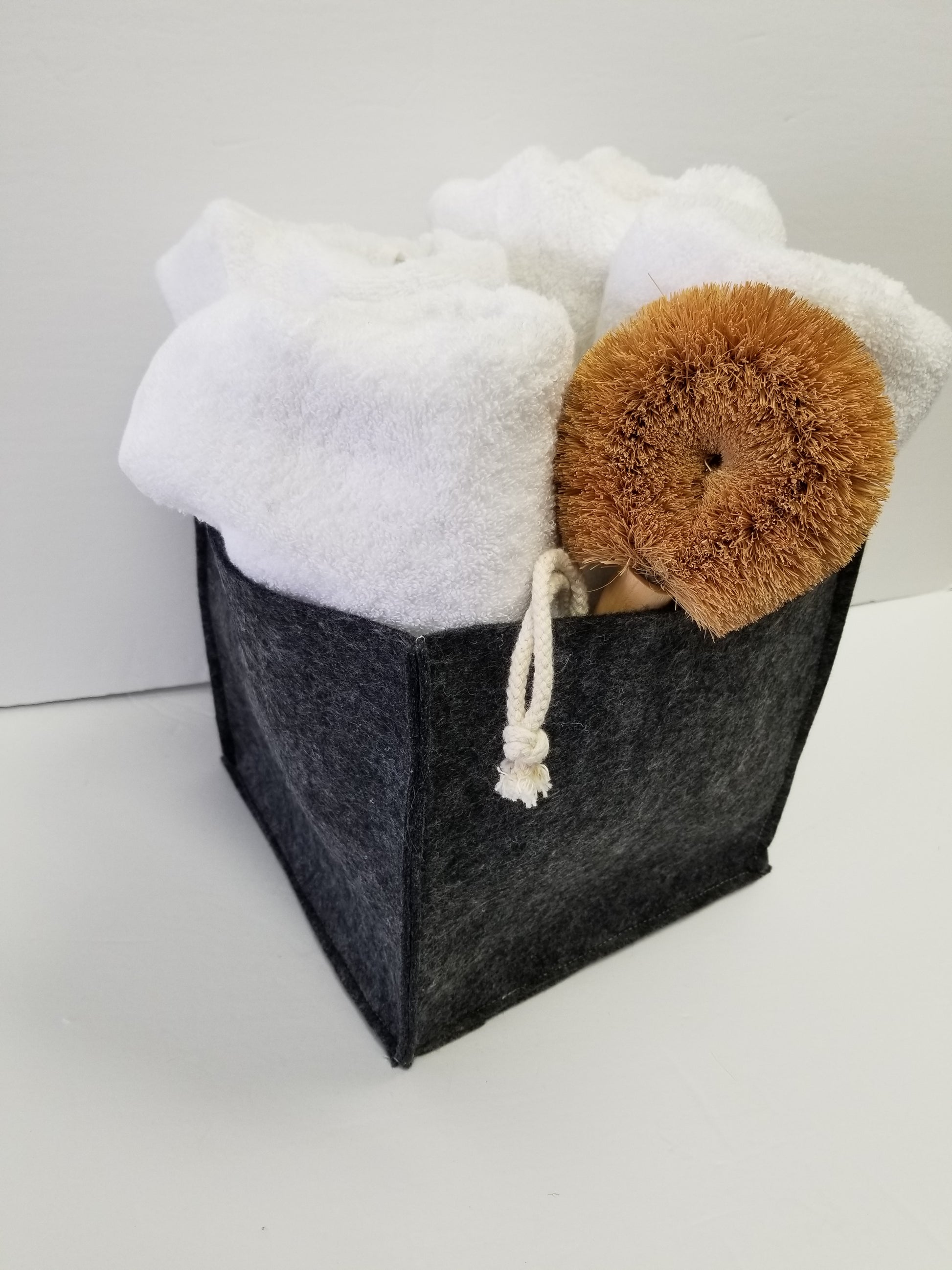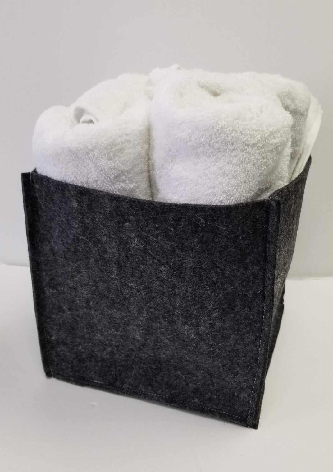 A sturdy upright mini storage box that hold quite a bit. This felt bin holds its shape and is wonderful for organizing one's space.