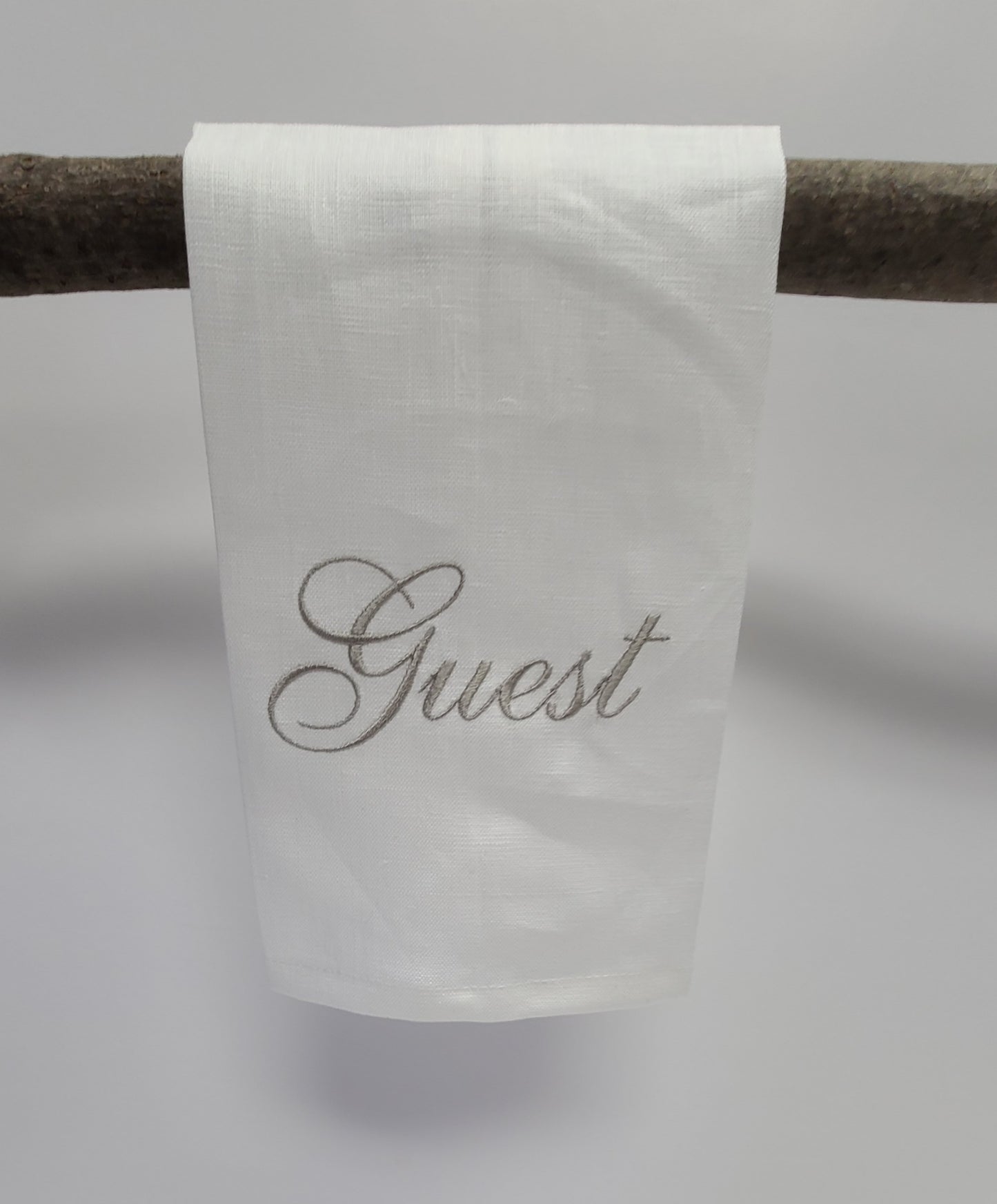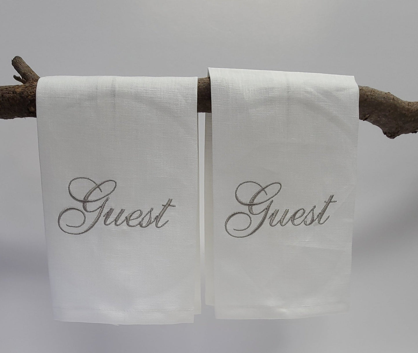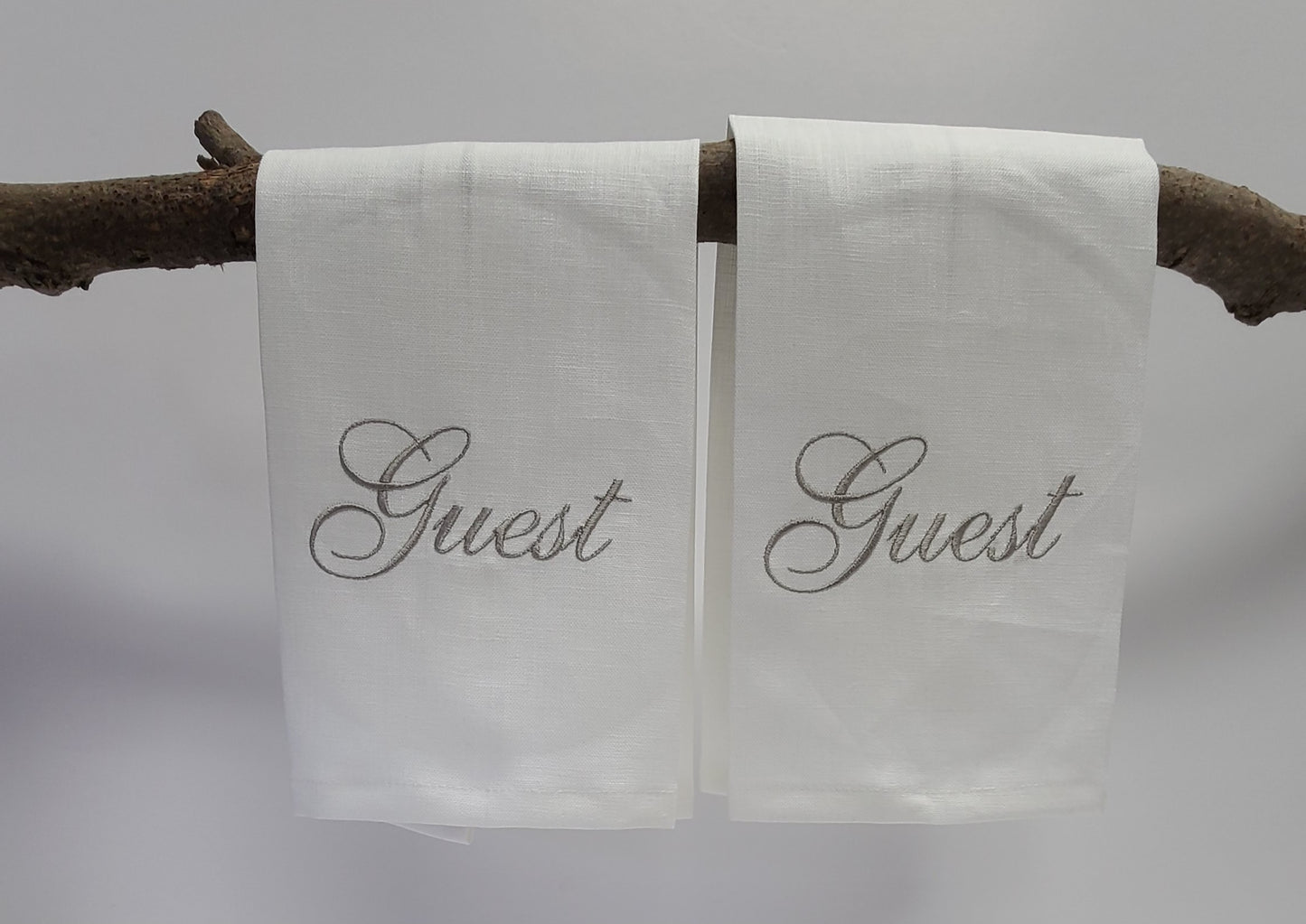 Add a touch of quirkiness to your powder room or guest room with this set of 2 natural linen finger tip towels. Embroidered with "Guest" in satin camel thread, these towels add a playful touch to your bathroom. Perfect for layering over terry towels, they are both stylish and functional.