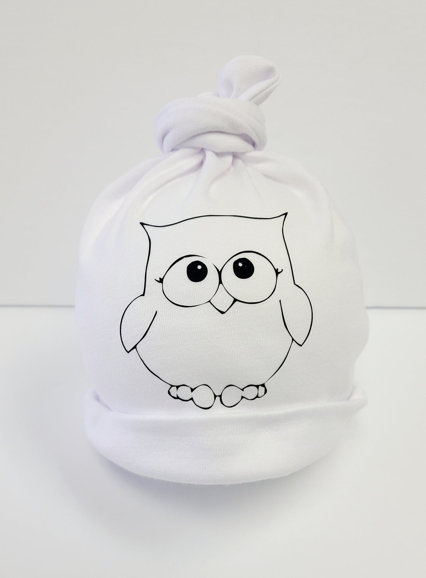 Happy the Owl Baby hat. Heat pressed in black. Top knotted.