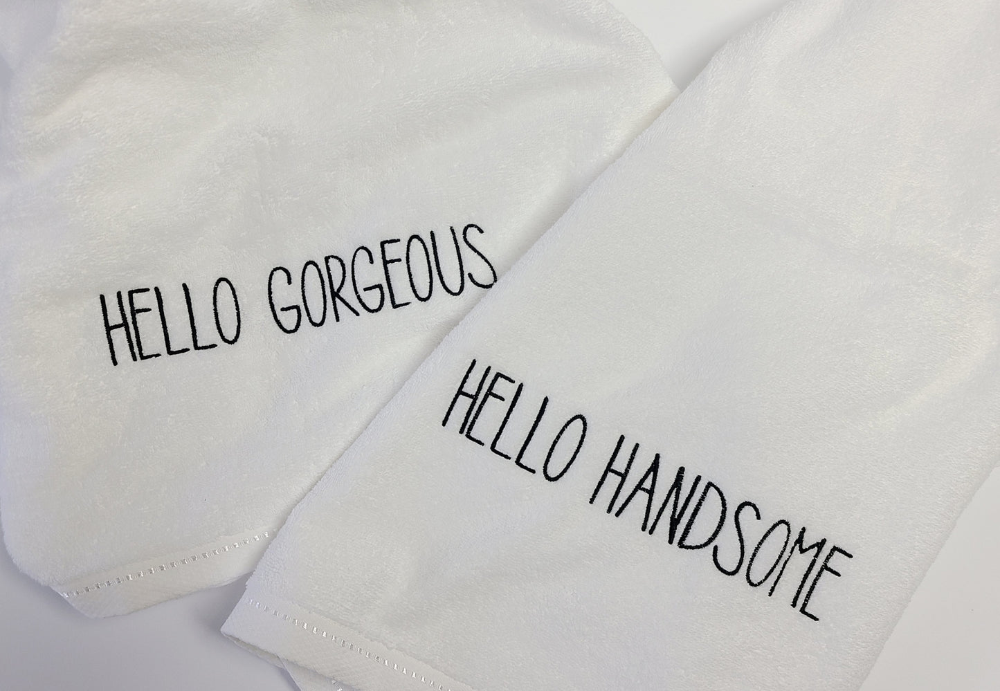 HELLO GORGEOUS and HELLO HANDSOME Bath Towel.