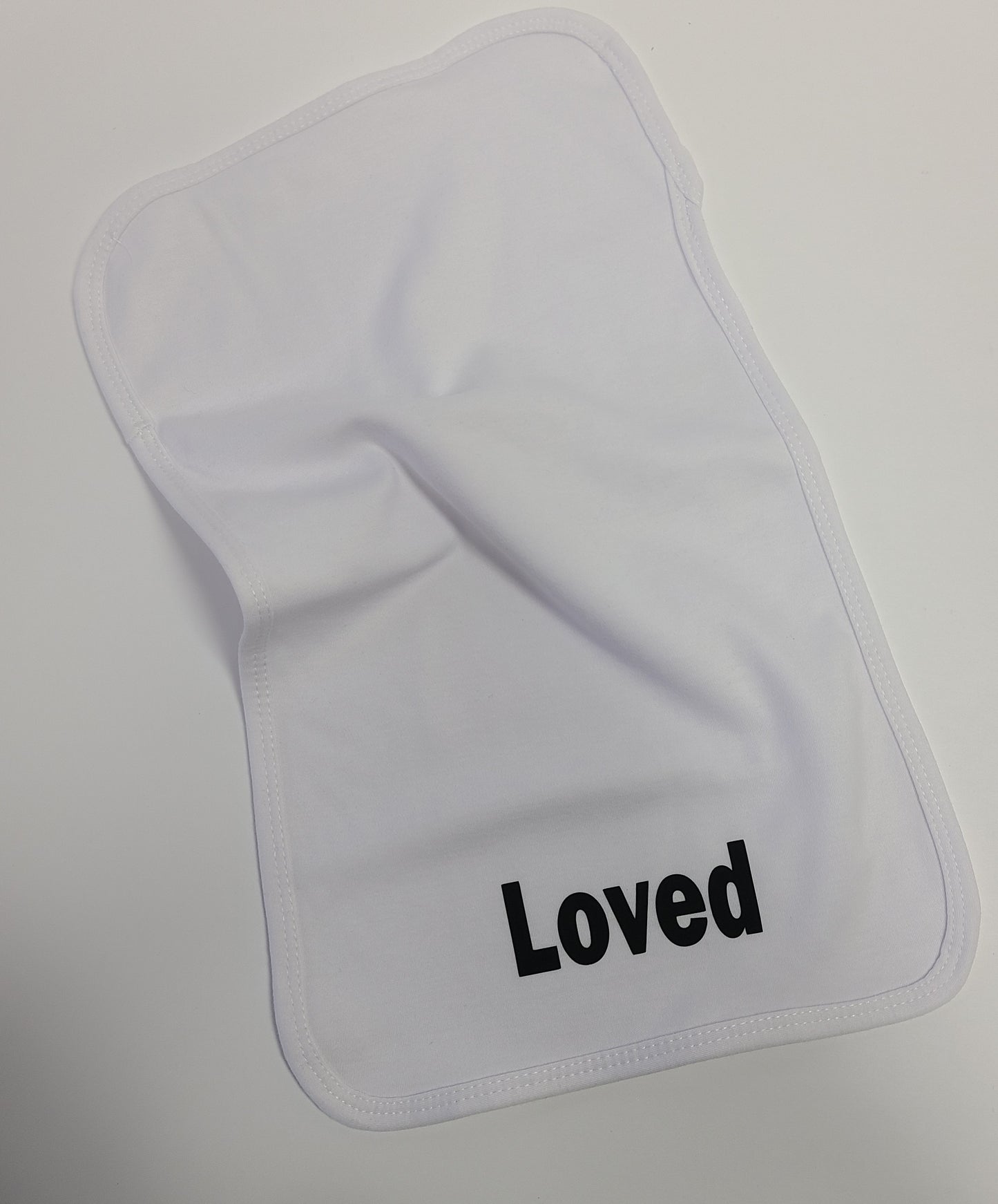 Cotton interlock LOVED burp cloth. Double layered burp cloth with 5/8" binding. These burp cloths are soft and practical.