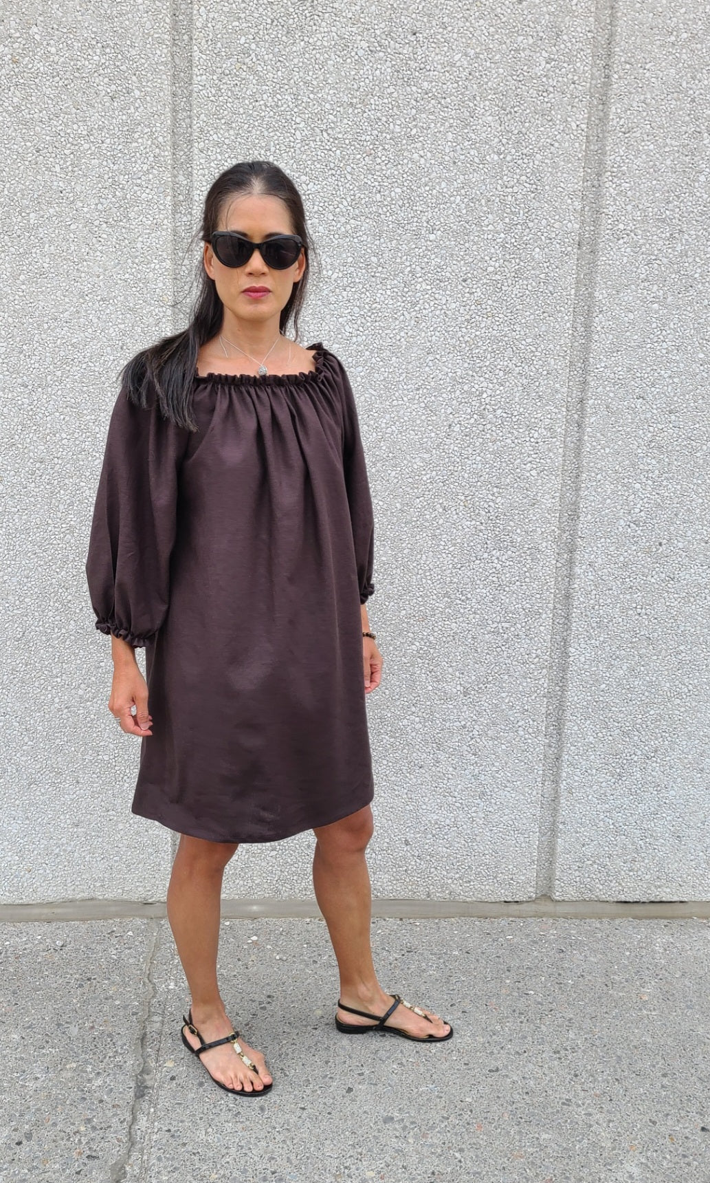 THE MIMI linen dress is breezy. Wear it up and over shoulders or pull it down to show a little shoulder. 3/4 length sleeves with an elastic cuff.