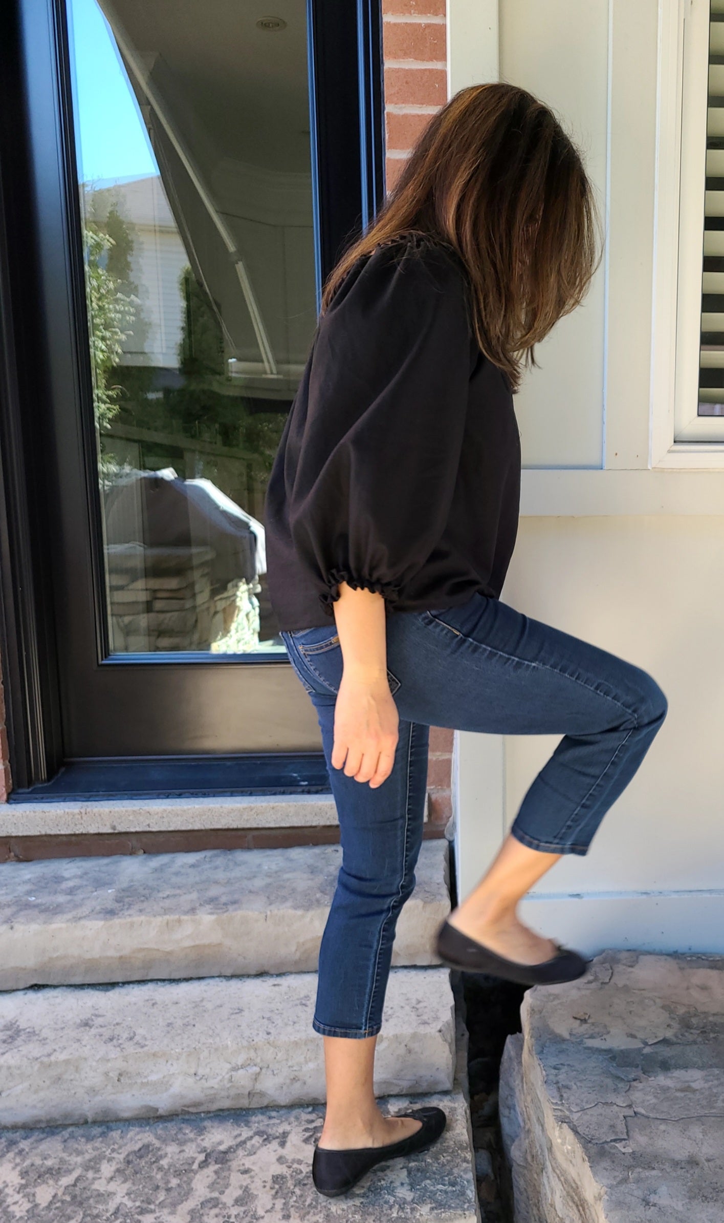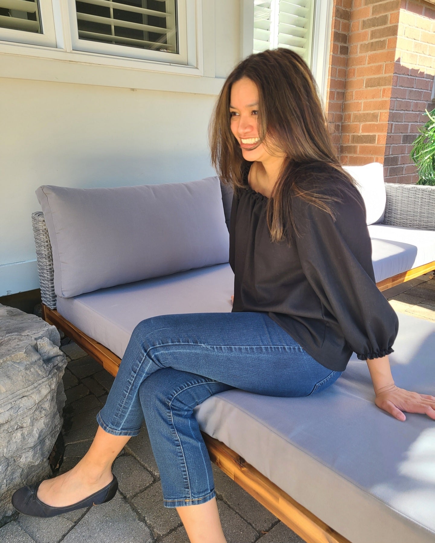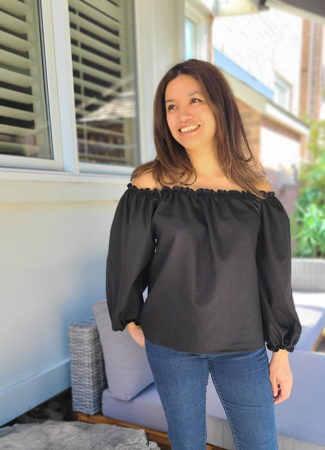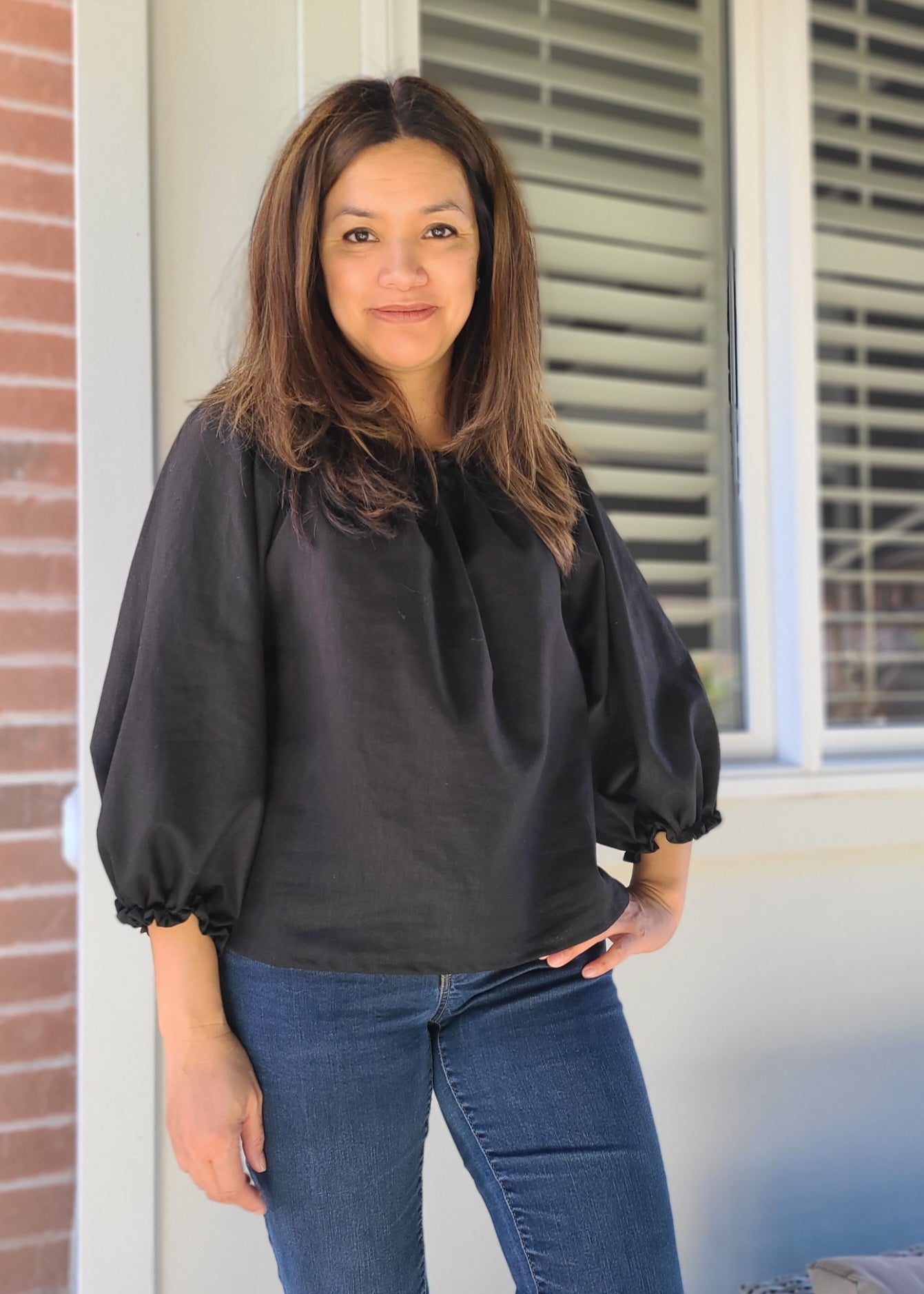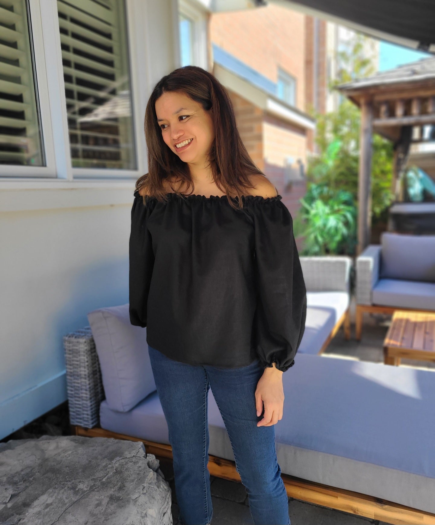 THE MIMI linen top is easy wear. Wear it up and over shoulders or pull it down to show a little shoulder. 3/4 length sleeves with an elastic cuff.