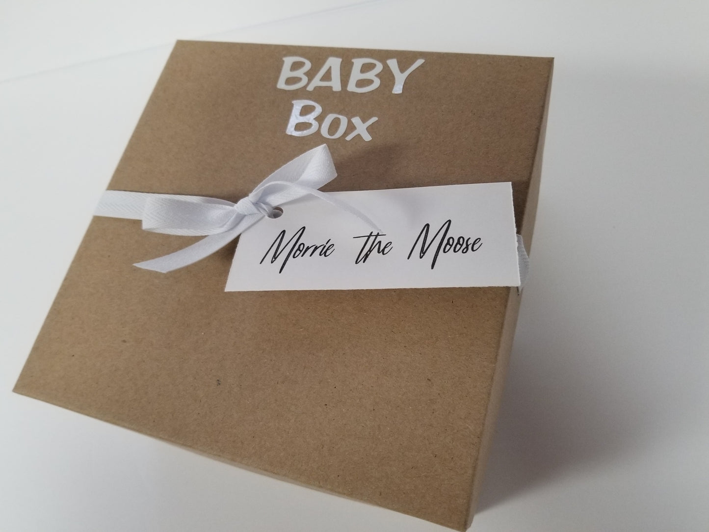 A gros grain ribbon tied brown box filled with goodies for the little one.