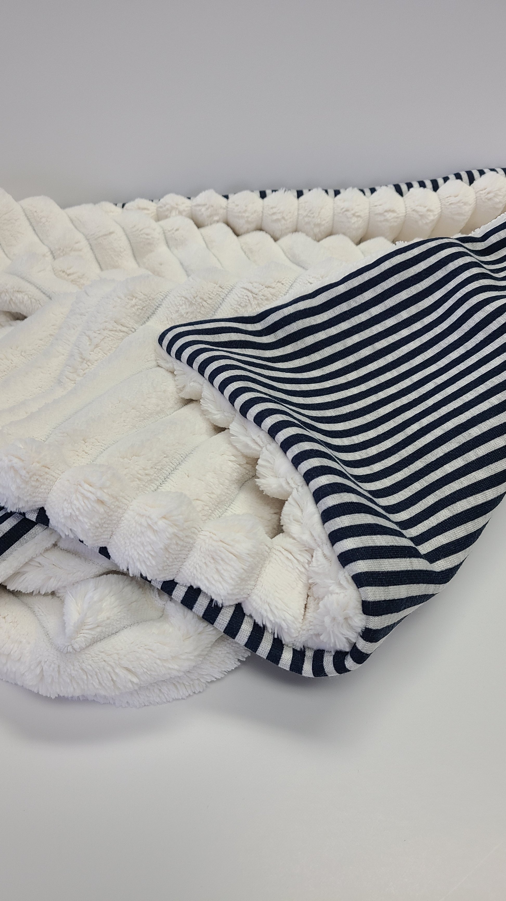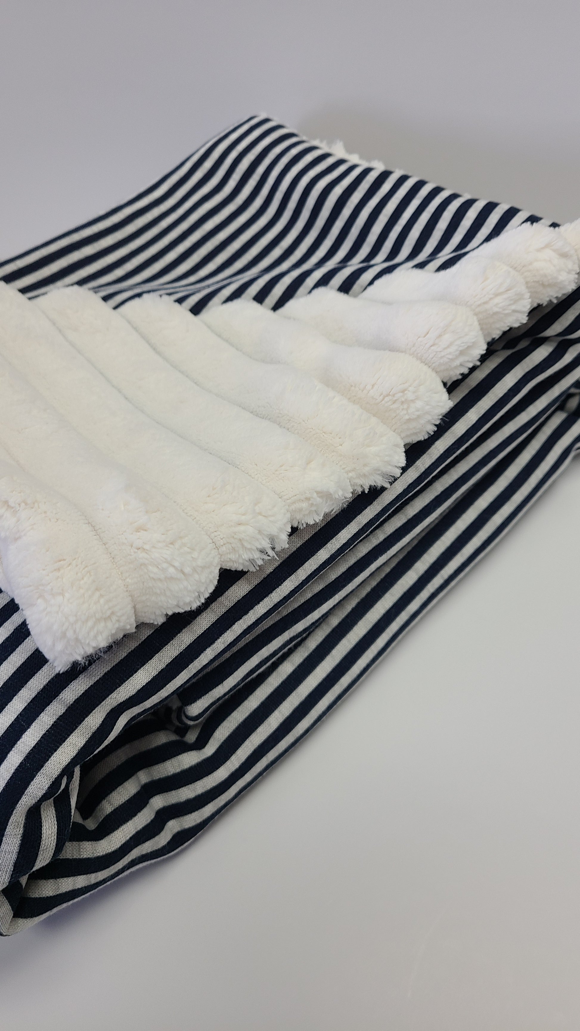 Wrap your little one in nautical charm with our Navy Stripe Baby Blanket! This cozy treasure features classic French navy stripes with light grey accents on the front, while the reverse side boasts super-soft corded chenille that babies simply can't resist. Perfect for bundling up your tiny sailor during naptime, stroller adventures, or cuddle sessions. It's not just a blanket—it's a warm hug that goes everywhere!