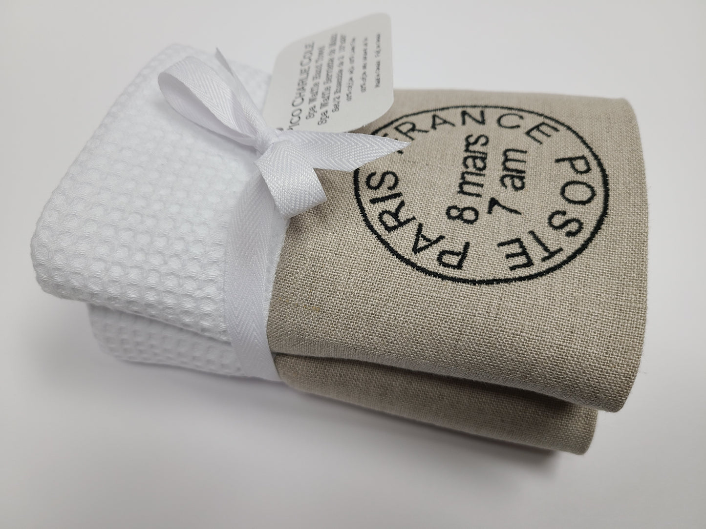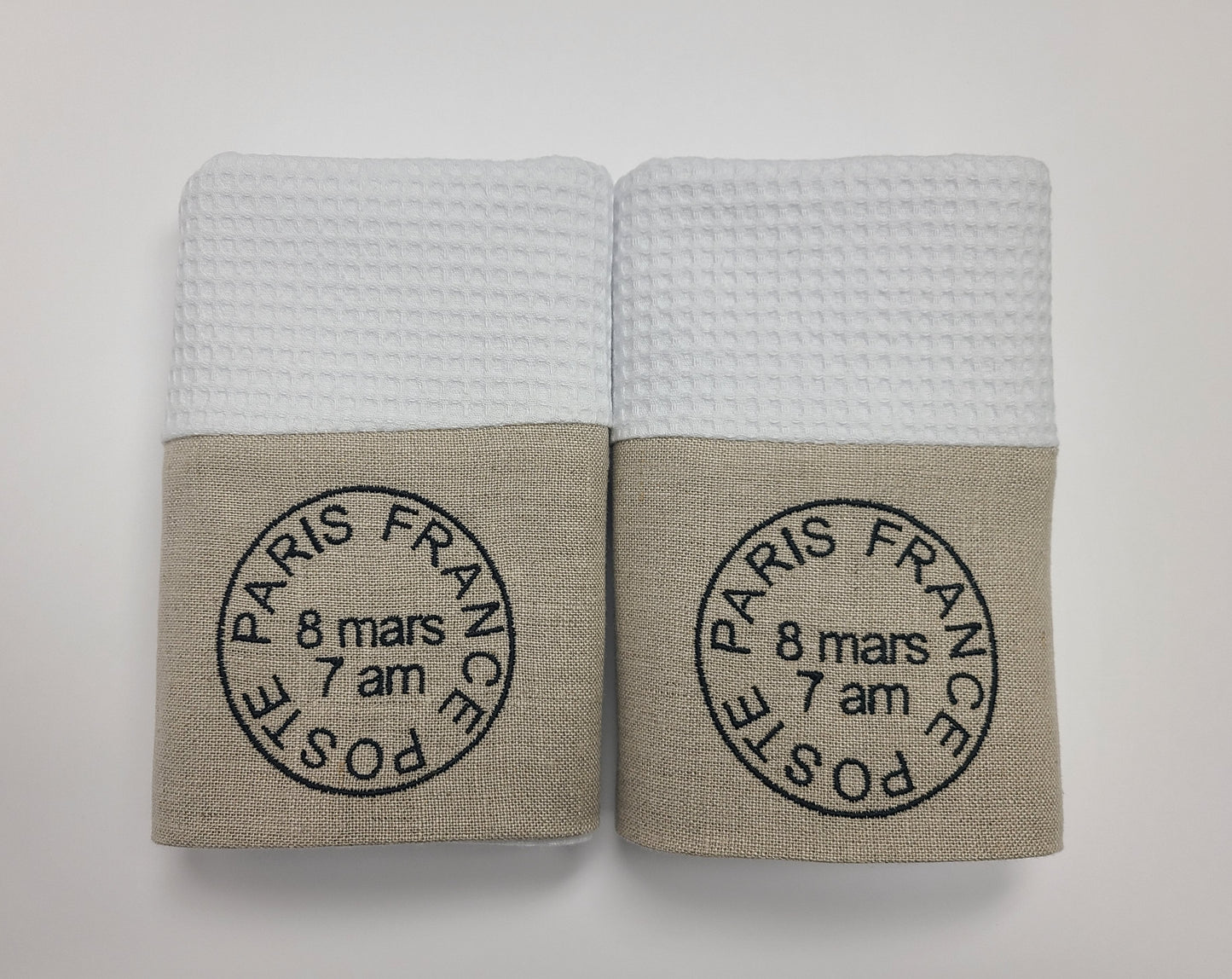 Our Paris post mark spa waffle Towel is double layered. Waffle weave top with a linen border. Set of 2 towels.