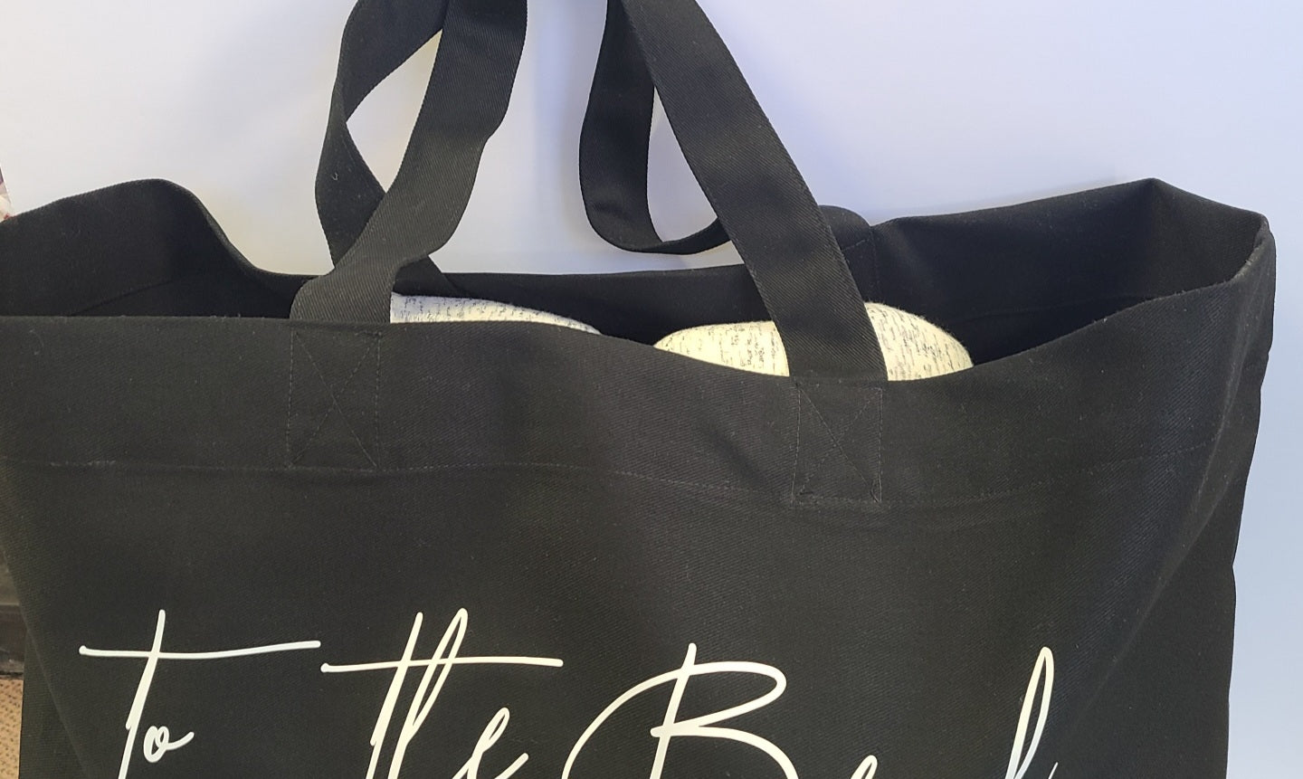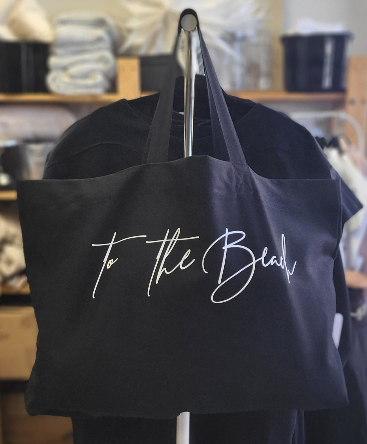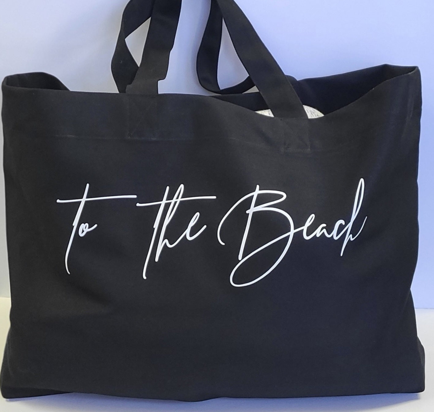 A generous size cotton denim tote bag. To the BEACH heat pressed in white.