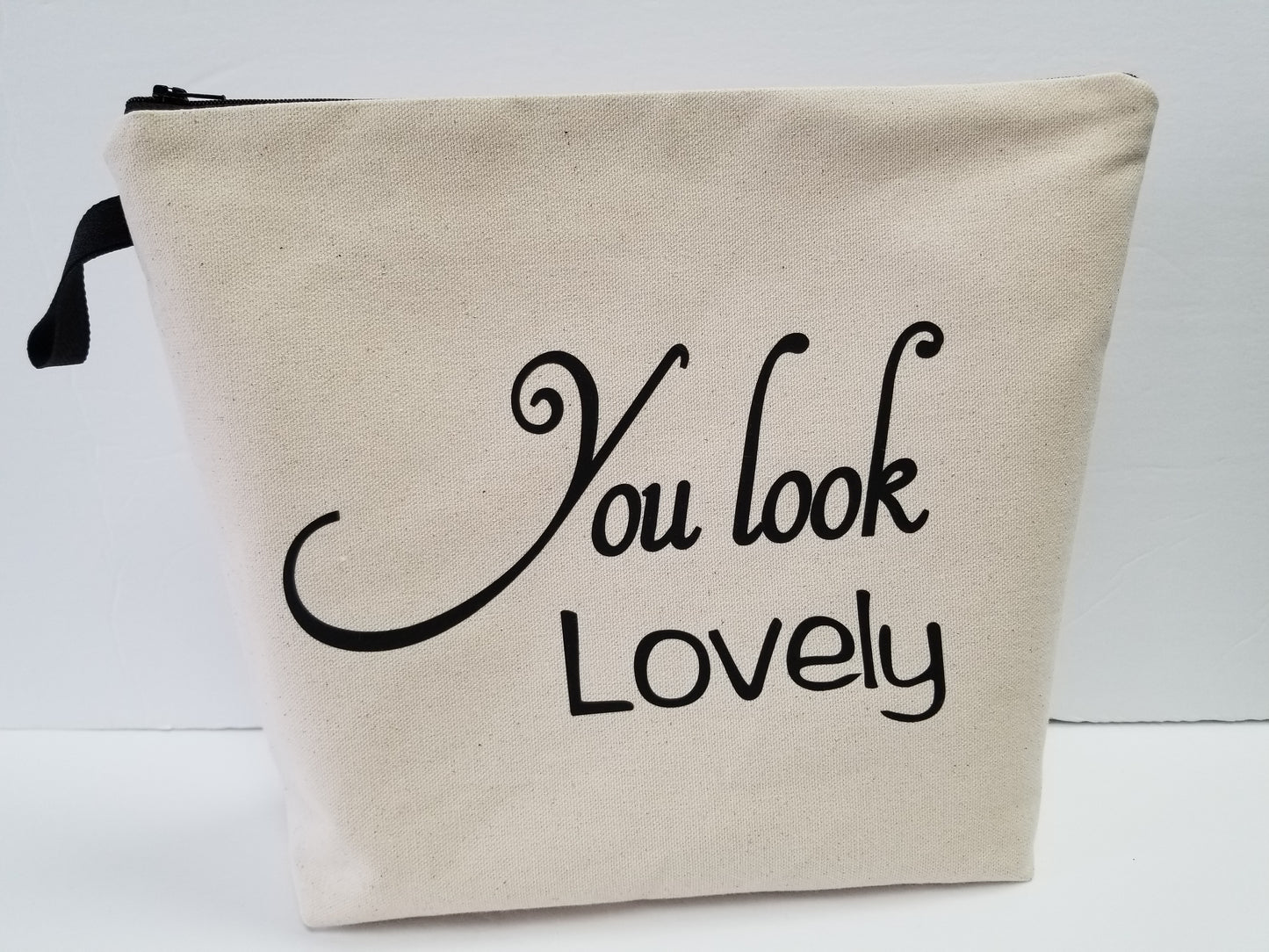 You look LOVELY toiletry, wash bag. Made from an organic cotton canvas exterior and and organic cotton canvas interior. Great for storing anything. Heat pressed in black. Generous size.